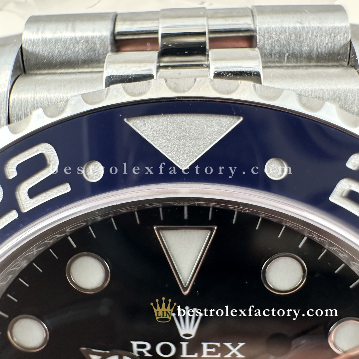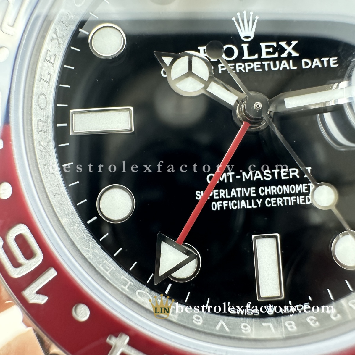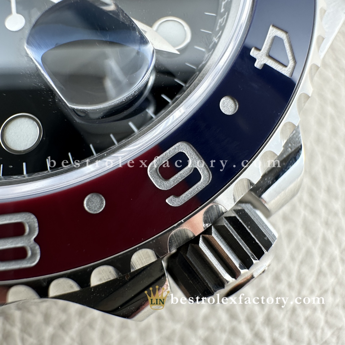 The ceramic bezel is the highlight. The red and blue are rich and vivid, with a glossy finish that catches light in a way that screams authenticity. The color transition at 6 and 18 is seamless. Bezel clicks are tight and smooth, just like the gen. The rehaut engraving is sharp, perfectly aligned, and visible without being overbearing.