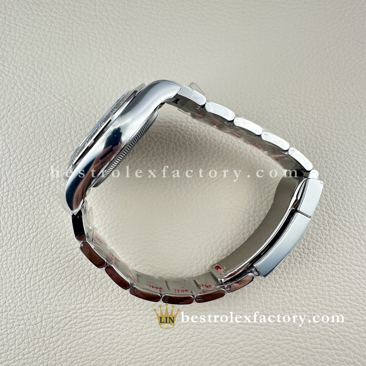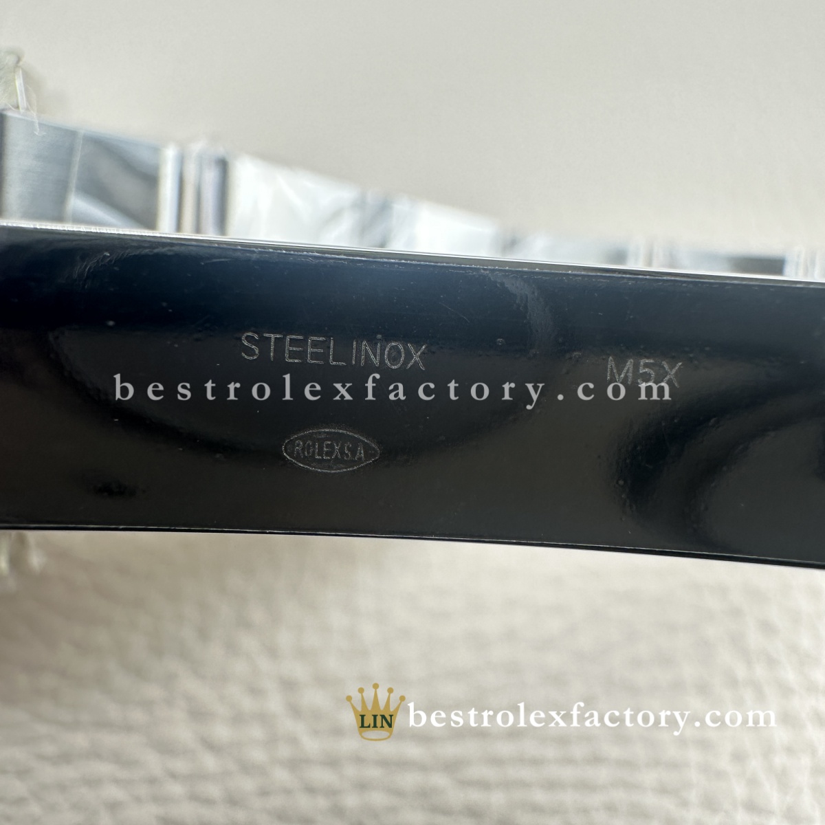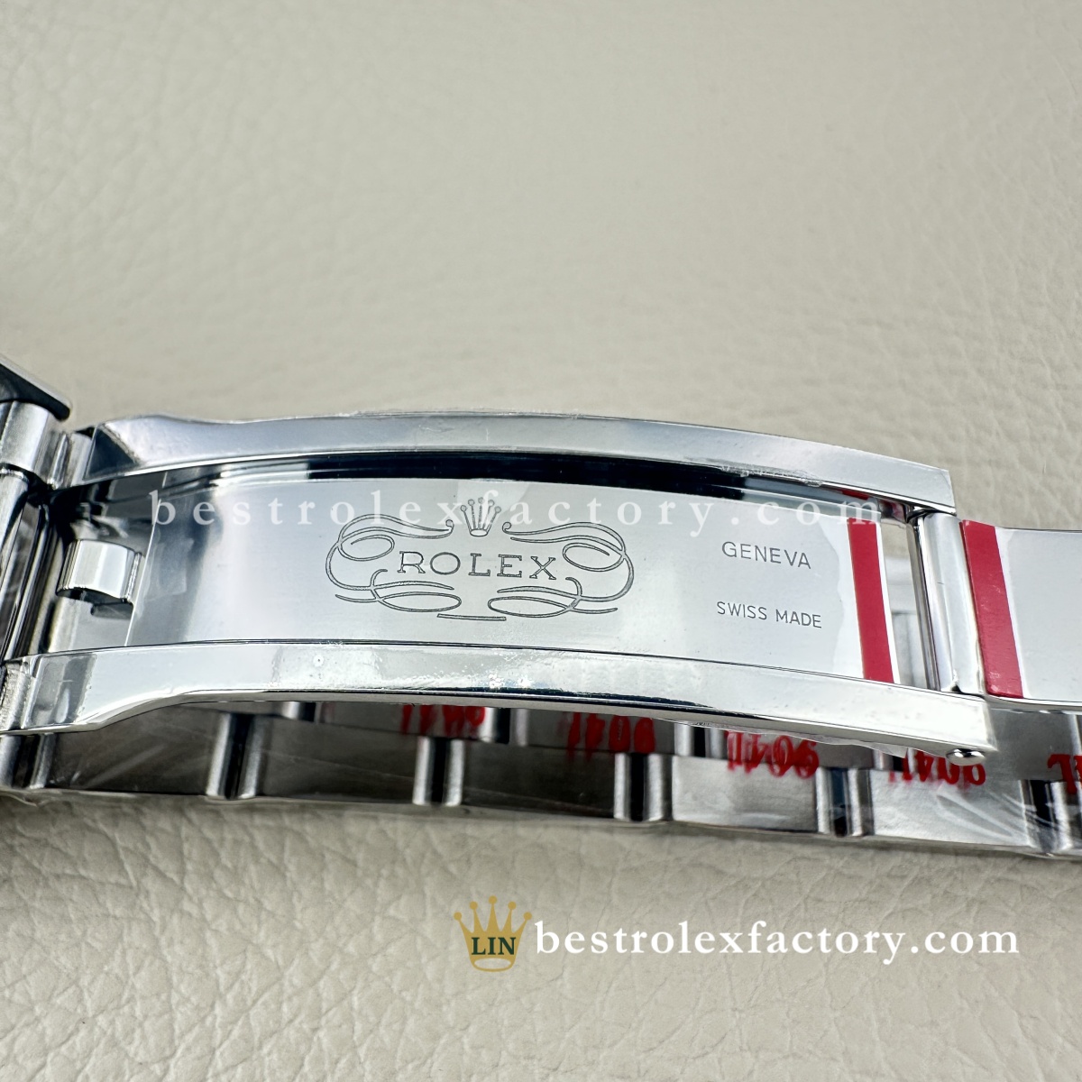 - Il bracciale? Sorprendentemente raffinato. Bilanciato, non ingombrante. Le maglie centrali luccicano proprio come l'originale --- perché abbiamo copiato il pattern di spazzolatura che Rolex usa. La chiusura si chiude come se fosse seria. Nessun tintinnio. Nessun gioco. Solo quel snap soddisfacente.