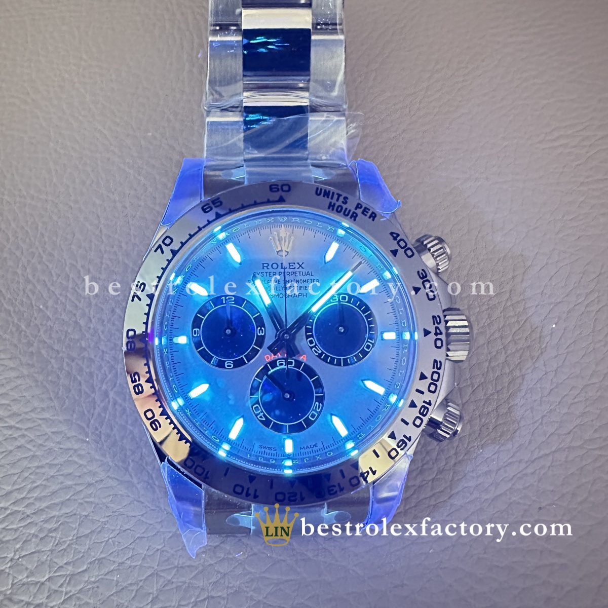 | DIAL | – It typically features a high-contrast design with a clean, legible layout. The dial is often adorned with three sub-dials (for measuring seconds, minutes, and hours), giving the watch a balanced, symmetrical look. The color performance is no different from the genuine in Any light Angle. – Hour markers and hands coated with Swiss bright lume Superluminova blue luminescent phosphorescent that glows up in the dark with uniform luminosity throughout – Highly legible with laser precision text, prints and engravings , 100% same as genuine – 18k white gold wrapped hour markers and hands to prevent tarnishing |