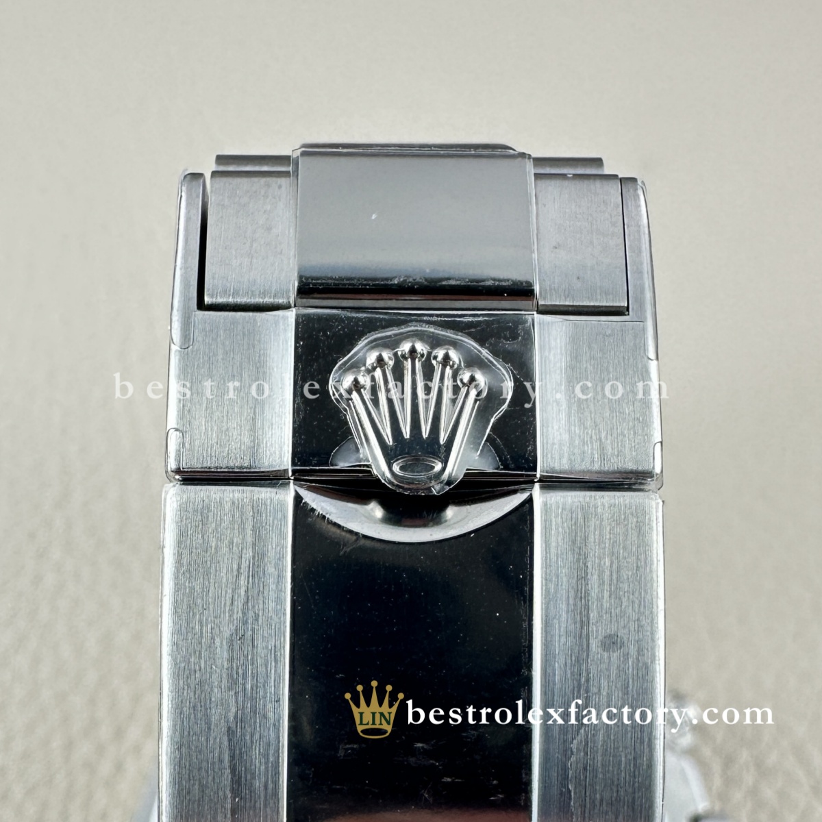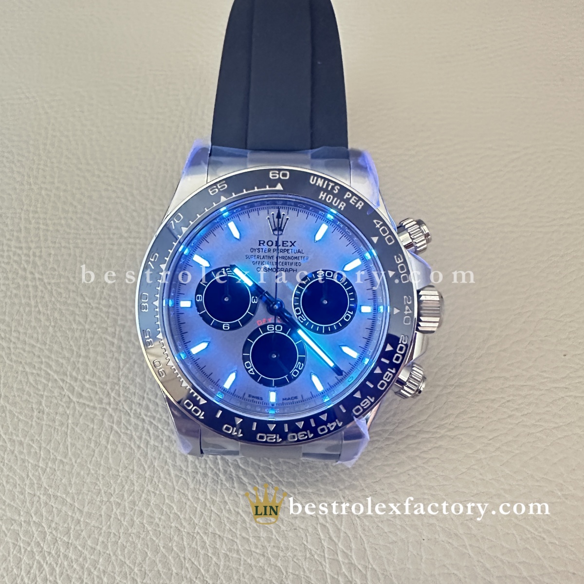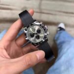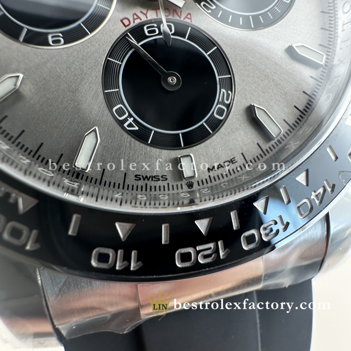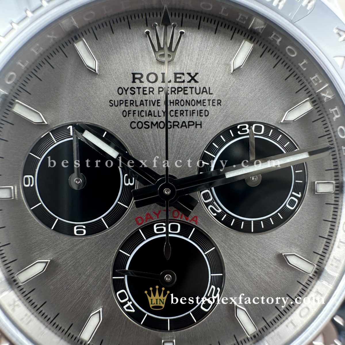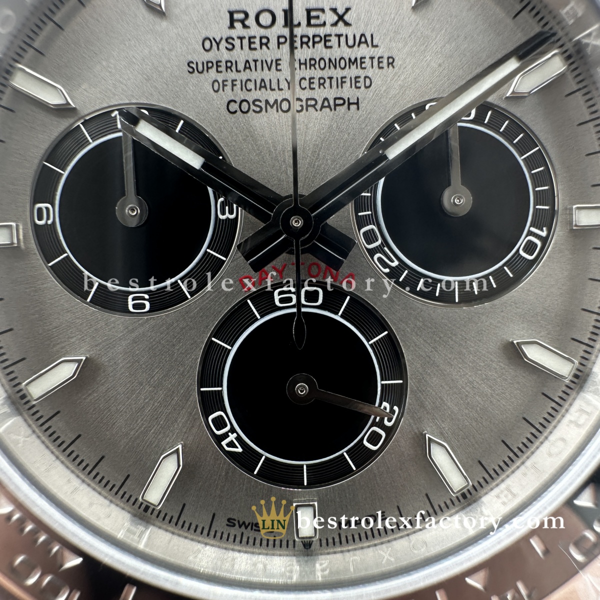 - Avvicinati e vedrai dove Clean Factory davvero si esibisce. La stampa del quadrante è affilata come un rasoio. Quei marcatori delle ore in oro bianco 18k catturano la luce perfettamente e si sentono sostanziali. I sottoquadranti del cronografo hanno questa profondità incassata perfetta con bordi puliti e nitidi. Persino il logo Rolex e il testo hanno quel peso del carattere perfetto e posizionamento che corrisponde esattamente al genuino.