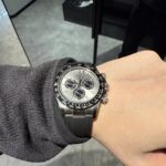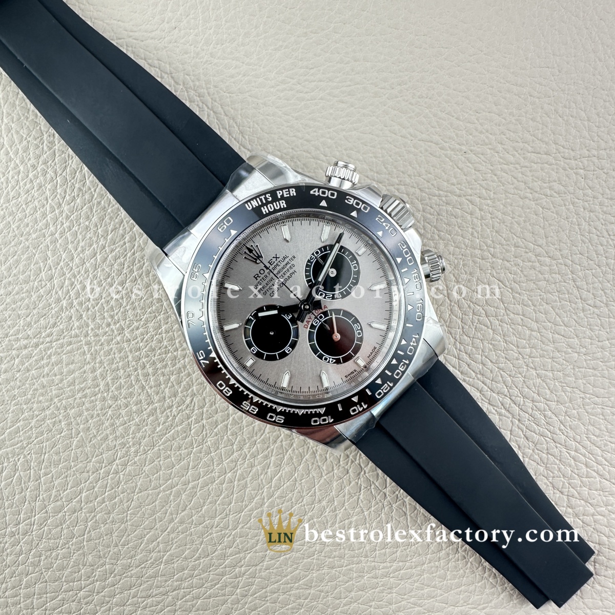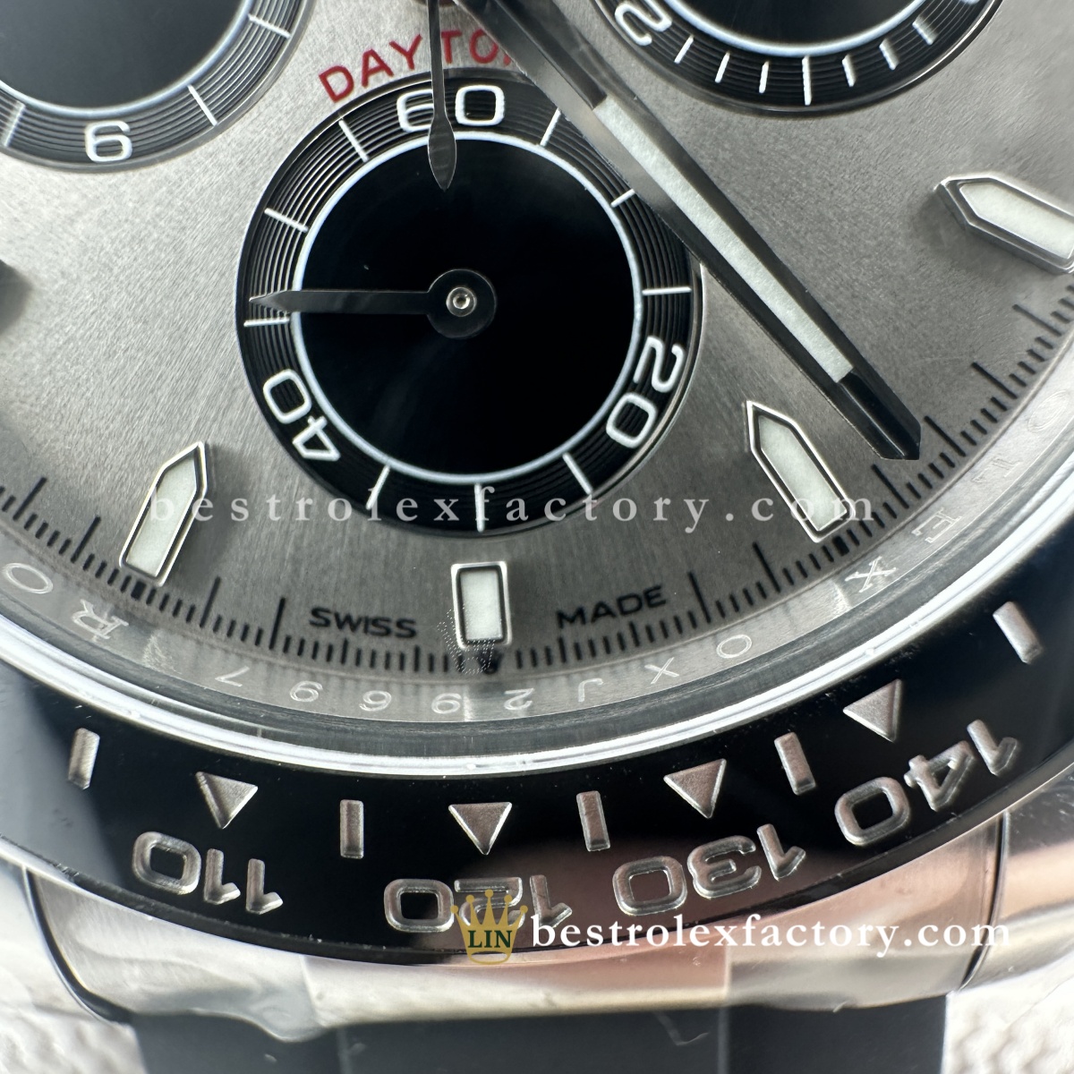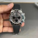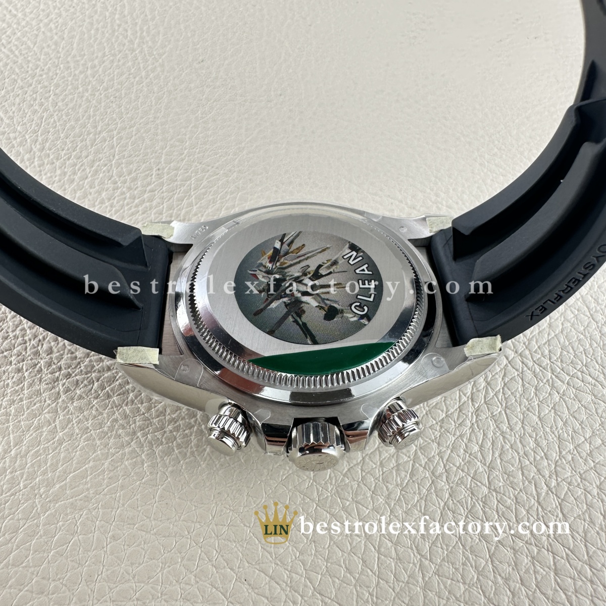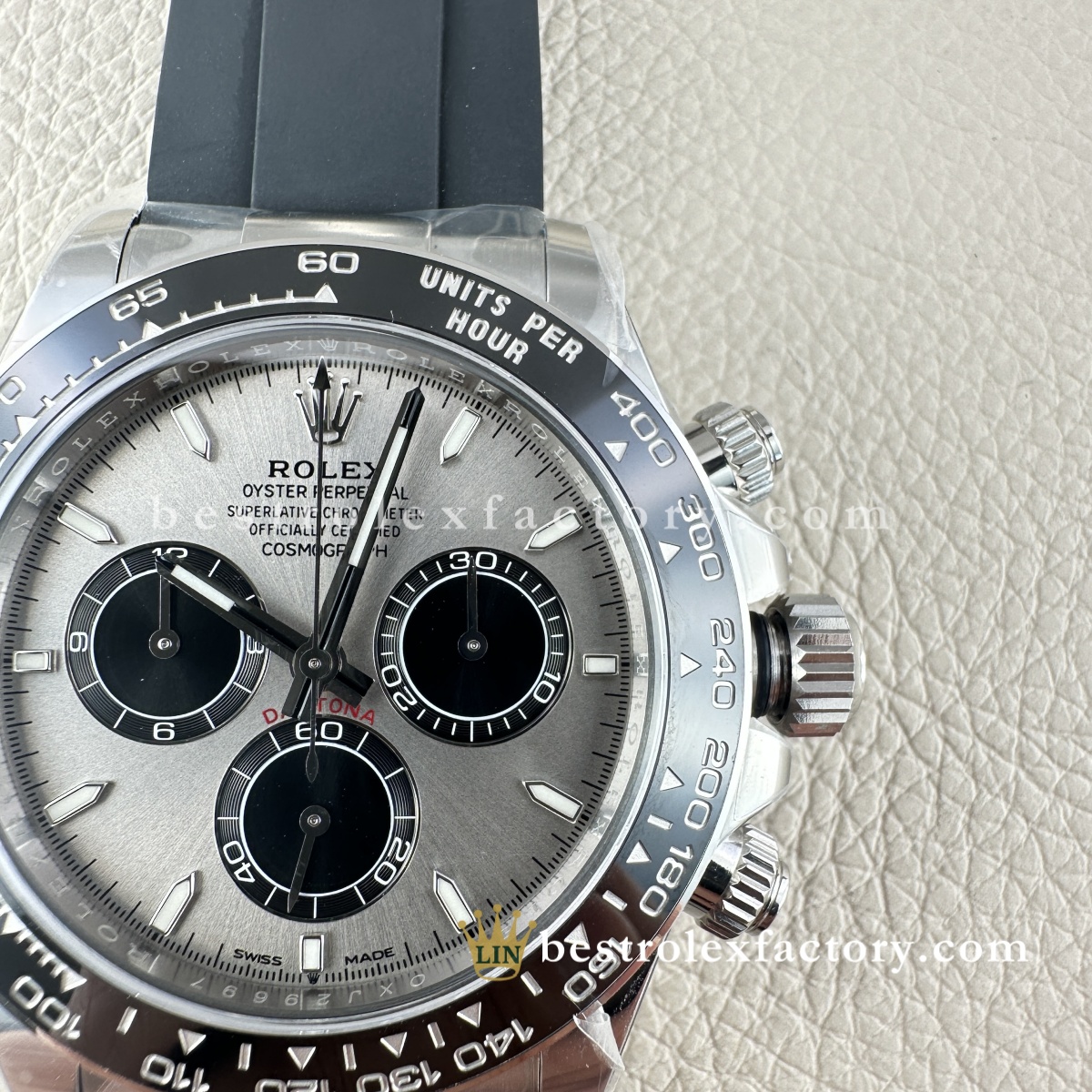 - Avvicinati e vedrai dove Clean Factory davvero si esibisce. La stampa del quadrante è affilata come un rasoio. Quei marcatori delle ore in oro bianco 18k catturano la luce perfettamente e si sentono sostanziali. I sottoquadranti del cronografo hanno questa profondità incassata perfetta con bordi puliti e nitidi. Persino il logo Rolex e il testo hanno quel peso del carattere perfetto e posizionamento che corrisponde esattamente al genuino.