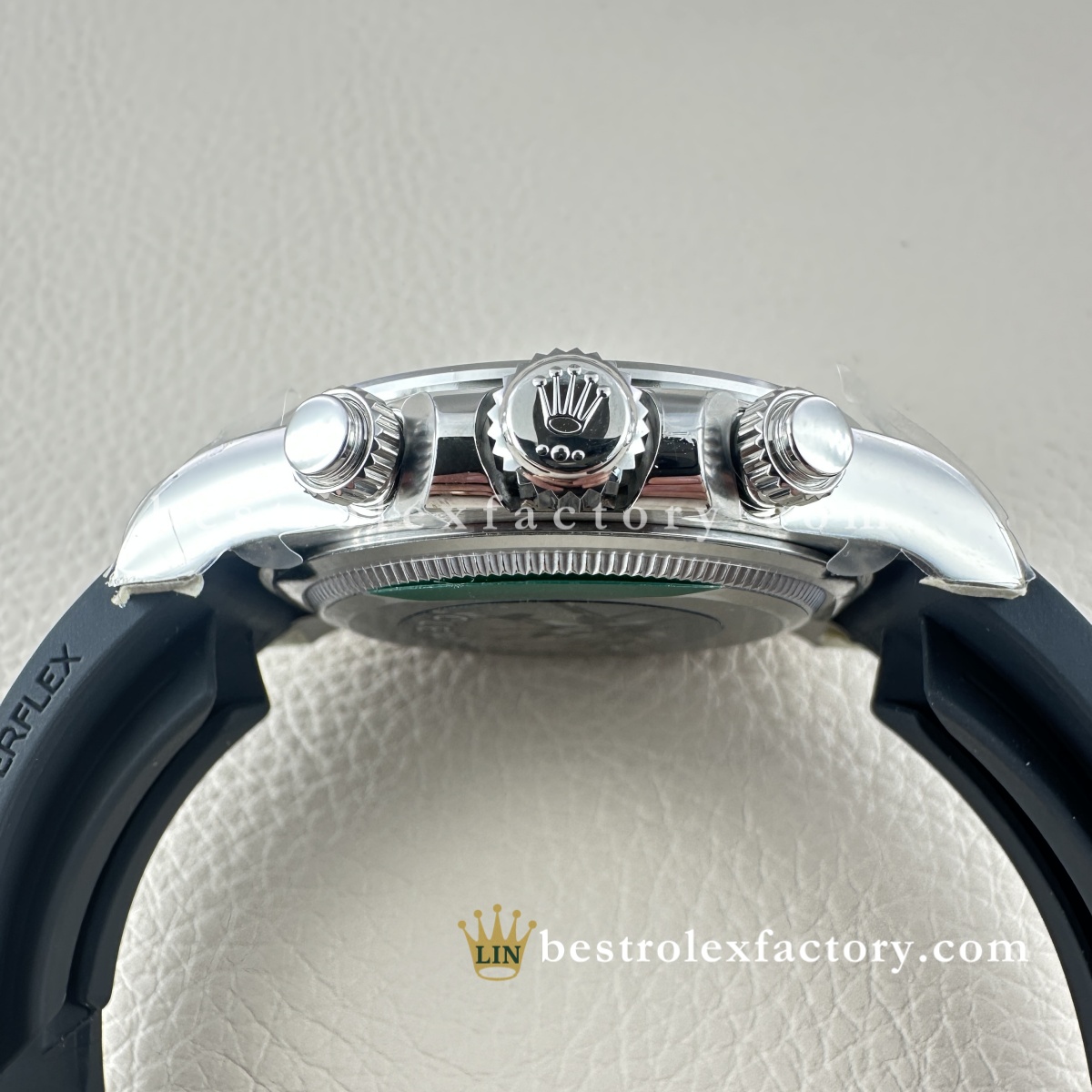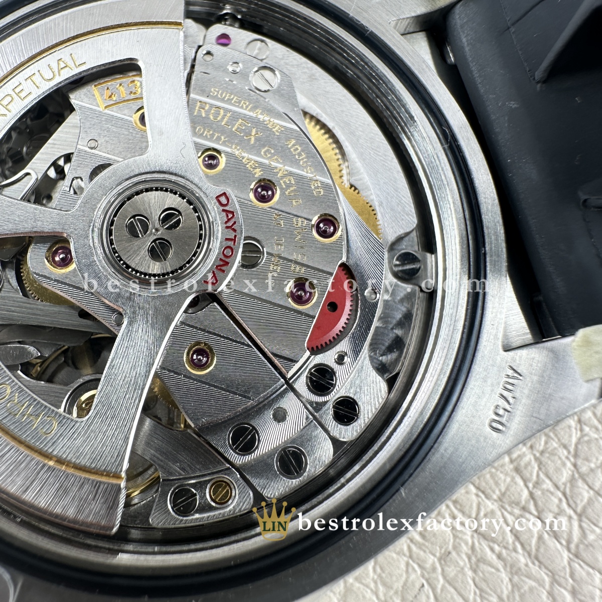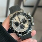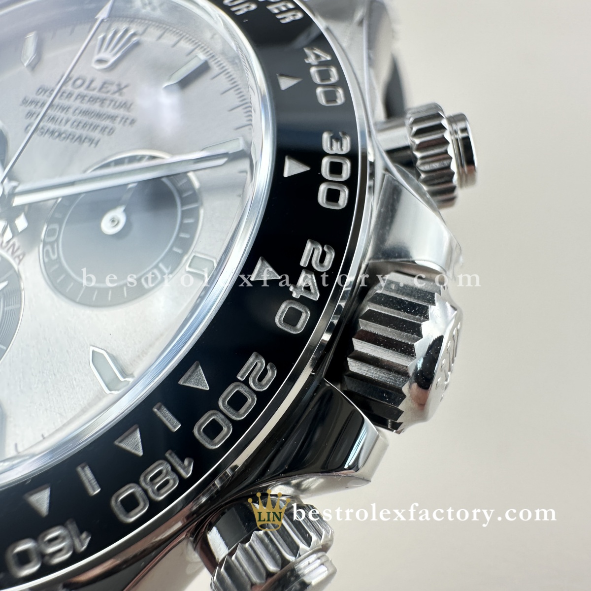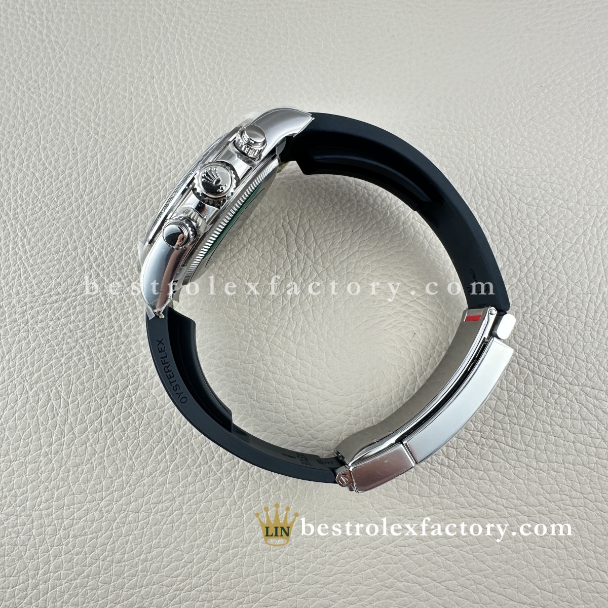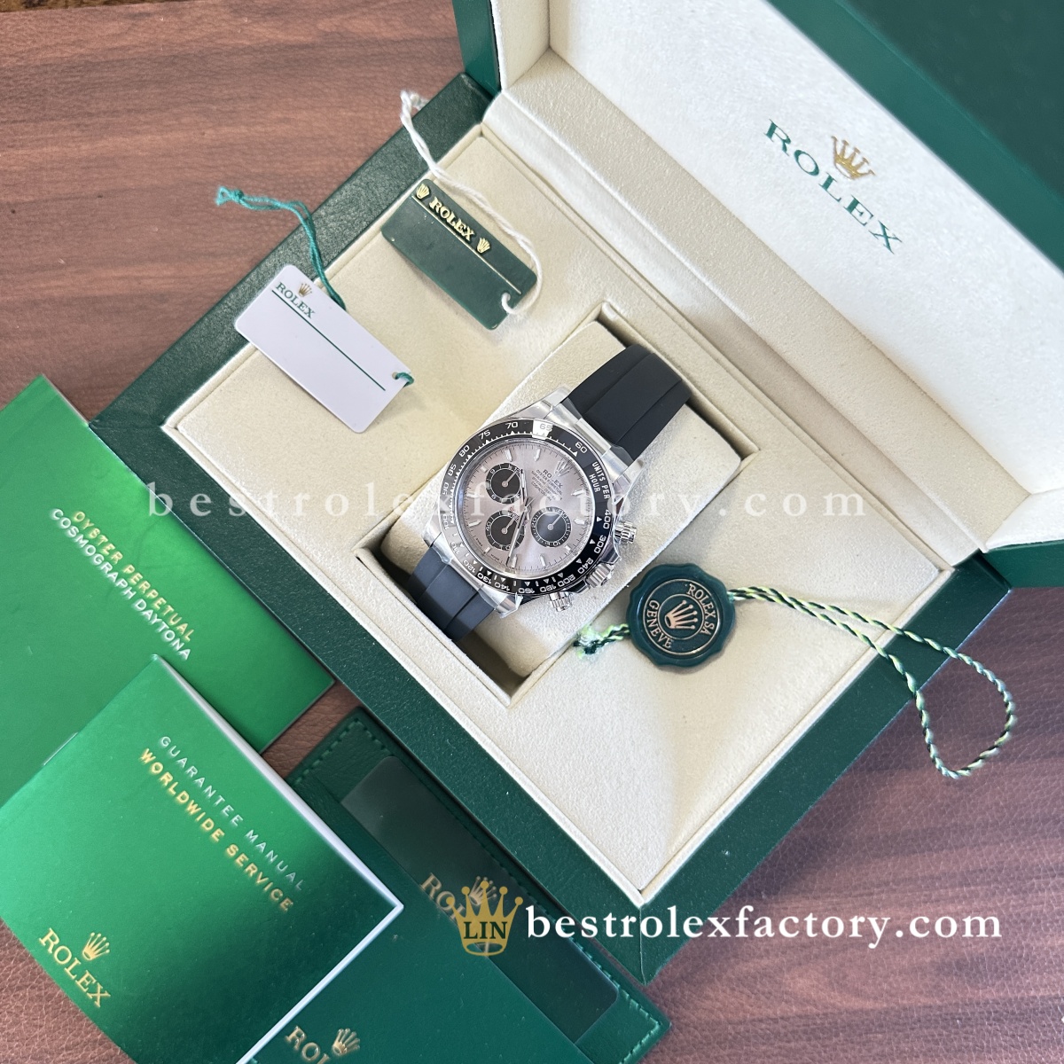 - Avvicinati e vedrai dove Clean Factory davvero si esibisce. La stampa del quadrante è affilata come un rasoio. Quei marcatori delle ore in oro bianco 18k catturano la luce perfettamente e si sentono sostanziali. I sottoquadranti del cronografo hanno questa profondità incassata perfetta con bordi puliti e nitidi. Persino il logo Rolex e il testo hanno quel peso del carattere perfetto e posizionamento che corrisponde esattamente al genuino.