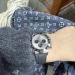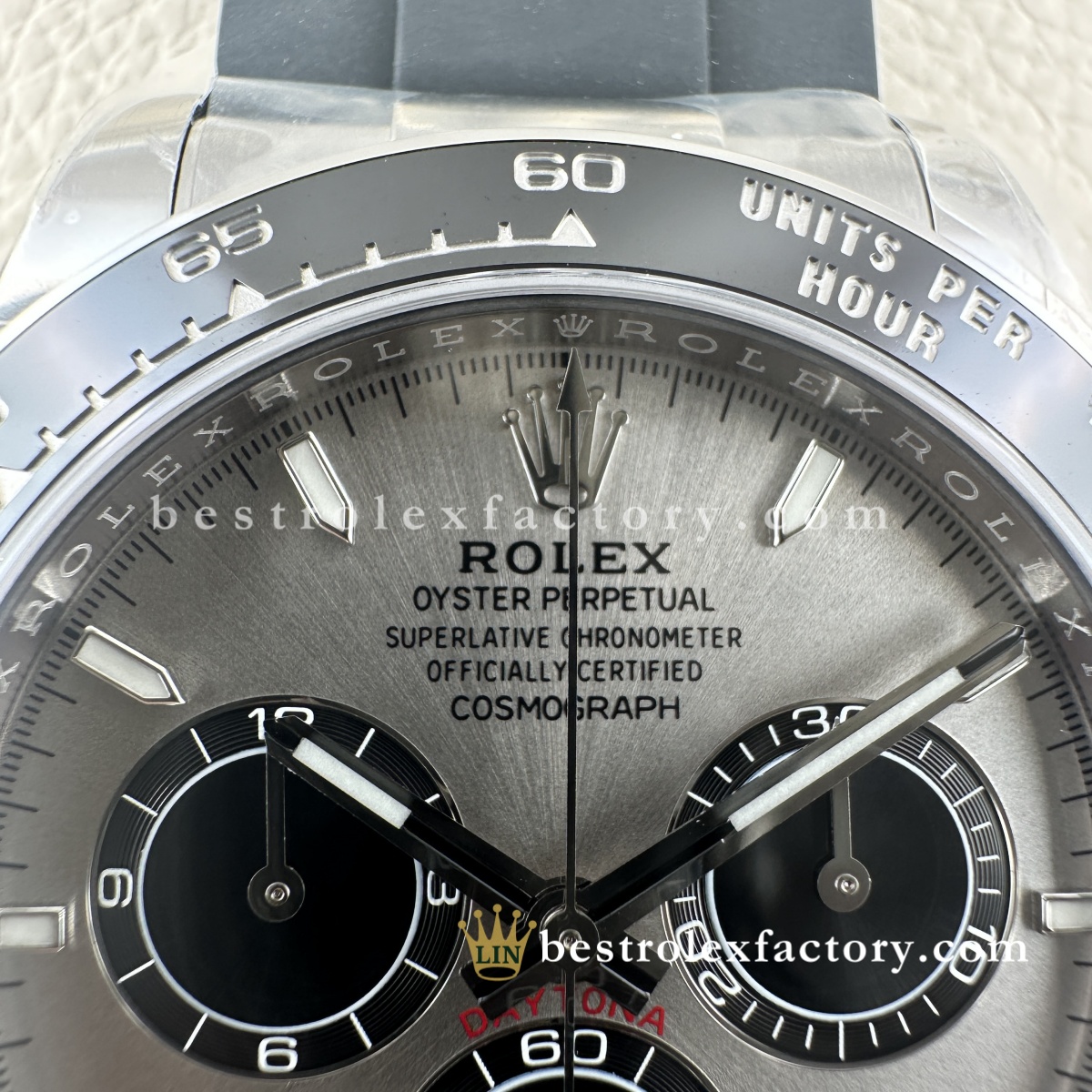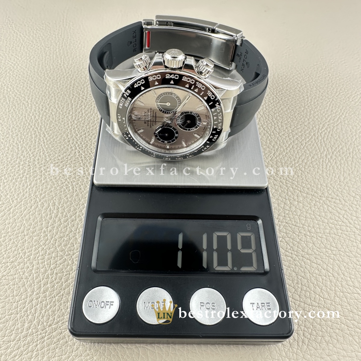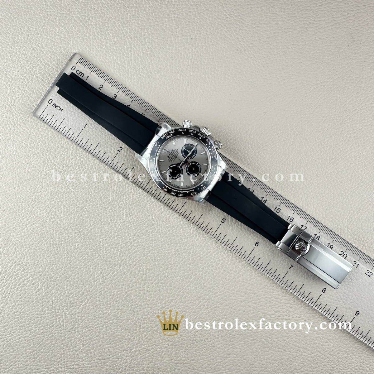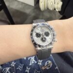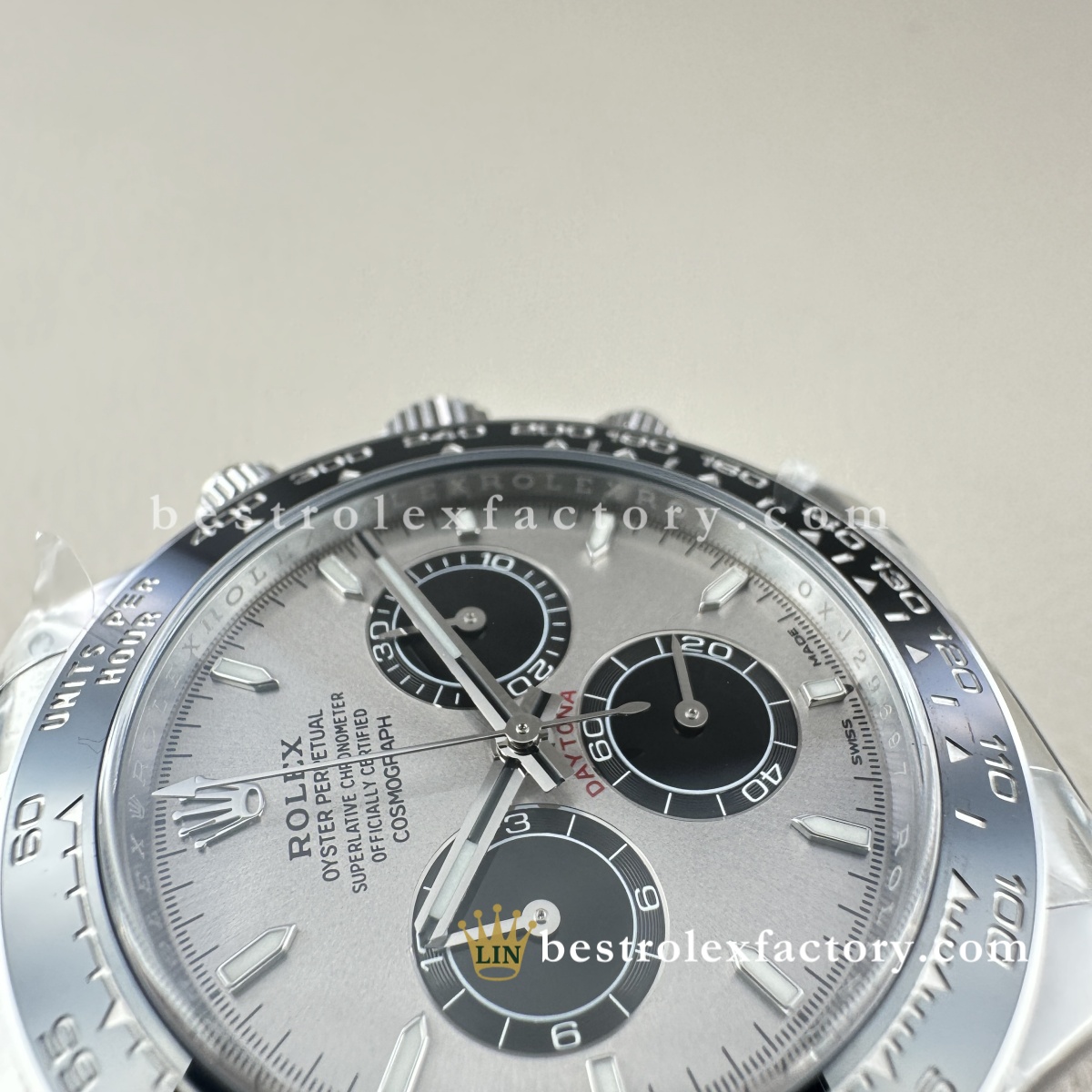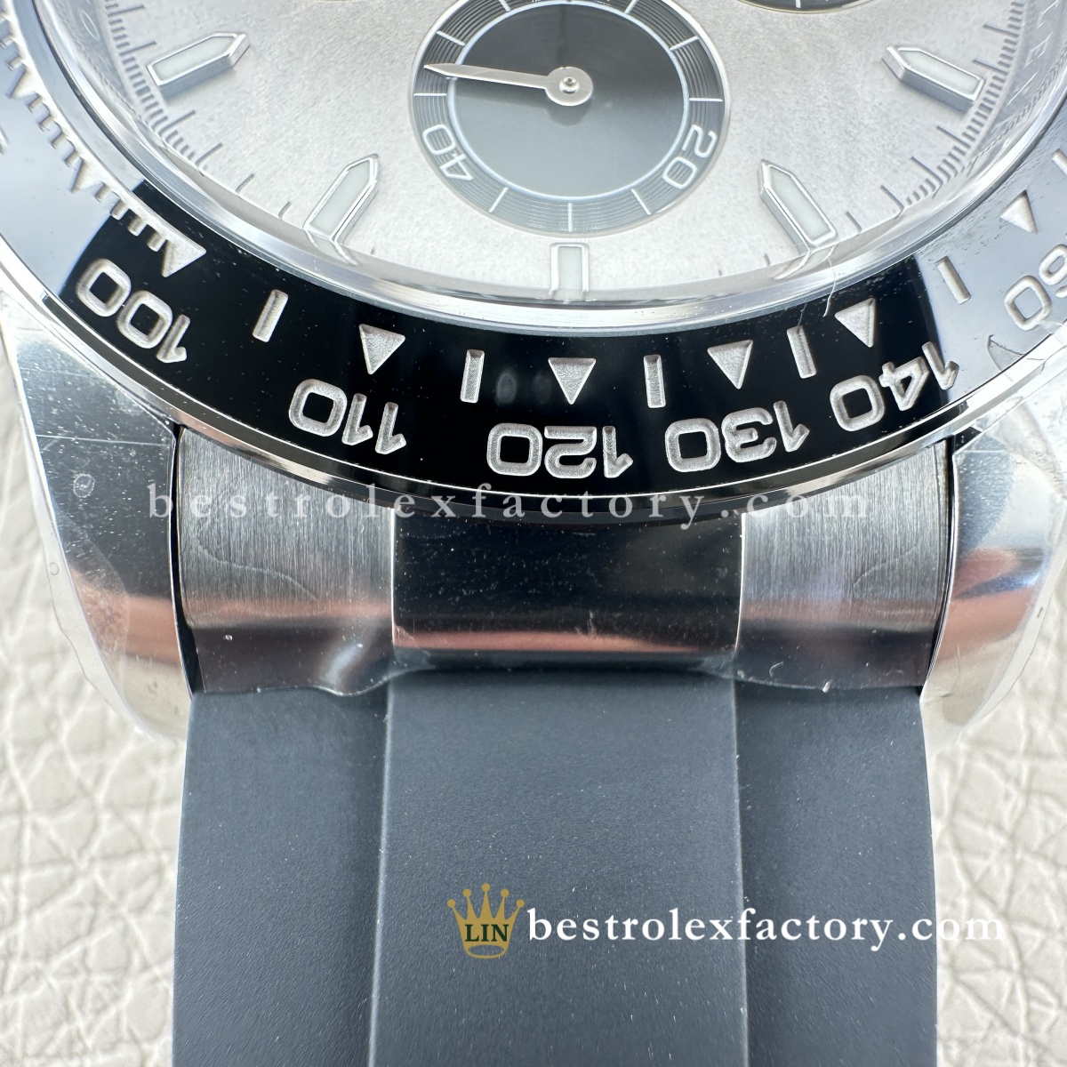 - Avvicinati e vedrai dove Clean Factory davvero si esibisce. La stampa del quadrante è affilata come un rasoio. Quei marcatori delle ore in oro bianco 18k catturano la luce perfettamente e si sentono sostanziali. I sottoquadranti del cronografo hanno questa profondità incassata perfetta con bordi puliti e nitidi. Persino il logo Rolex e il testo hanno quel peso del carattere perfetto e posizionamento che corrisponde esattamente al genuino.