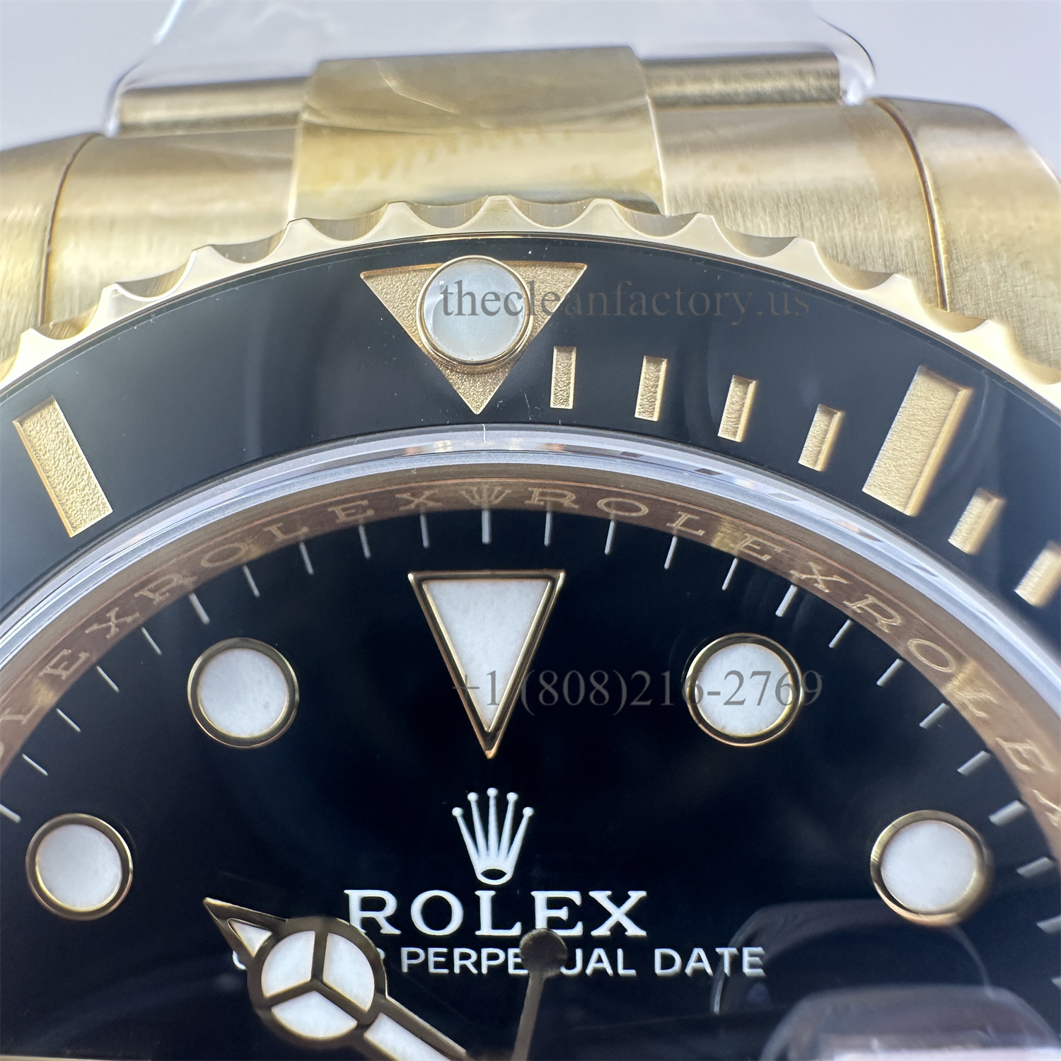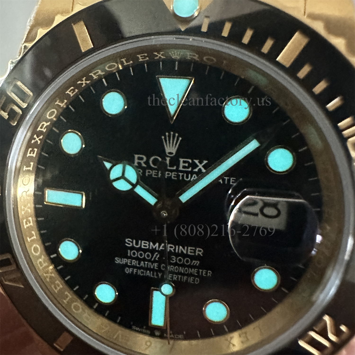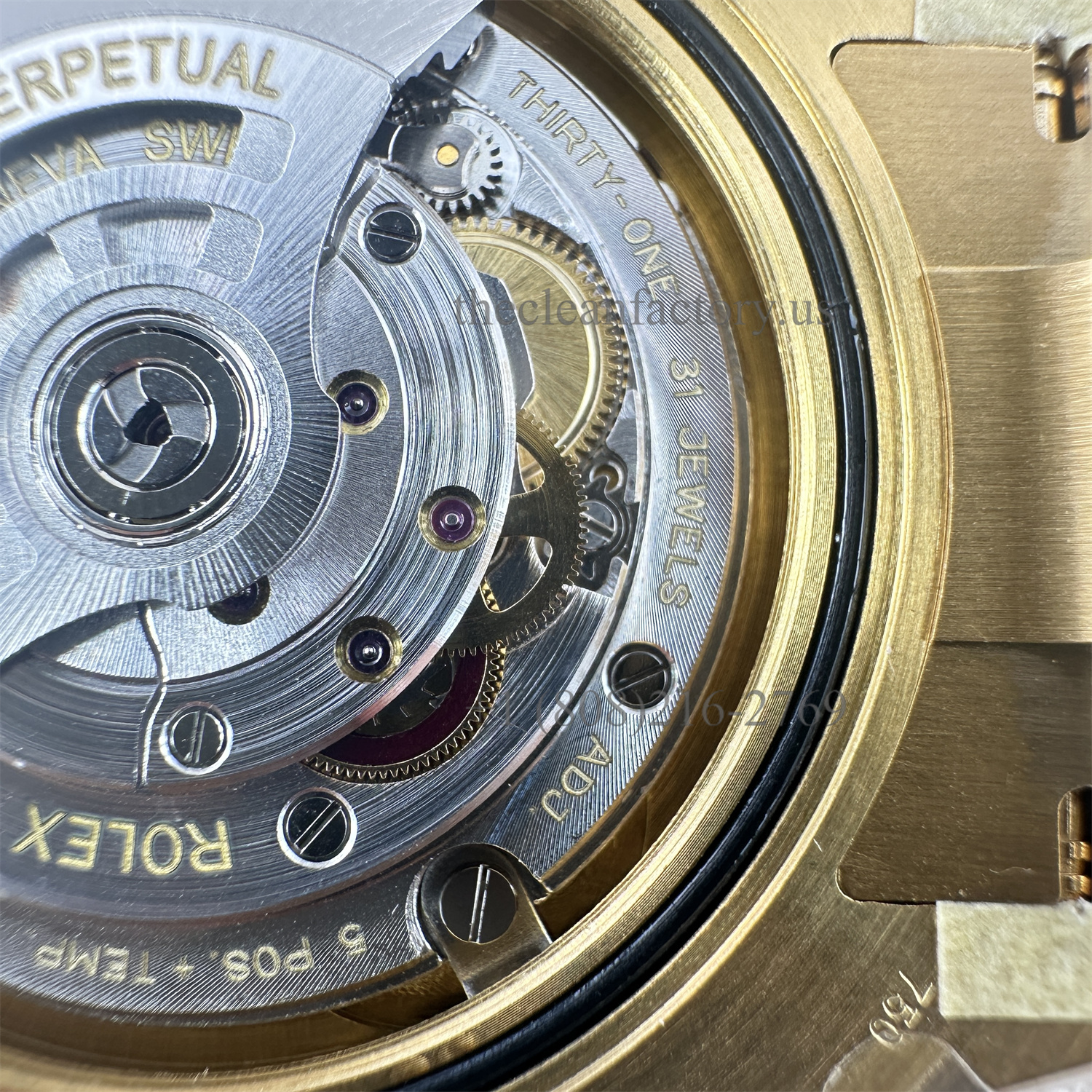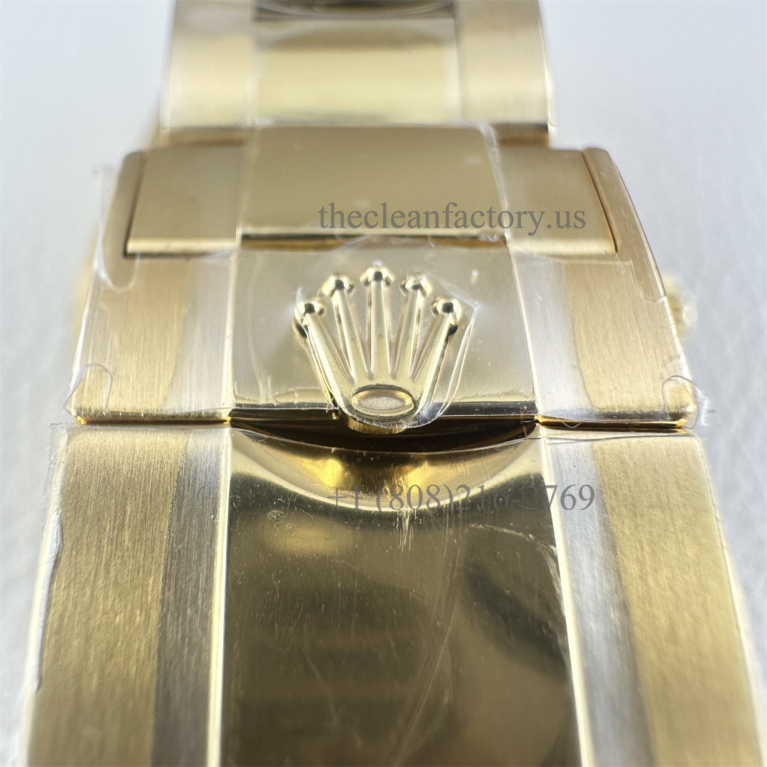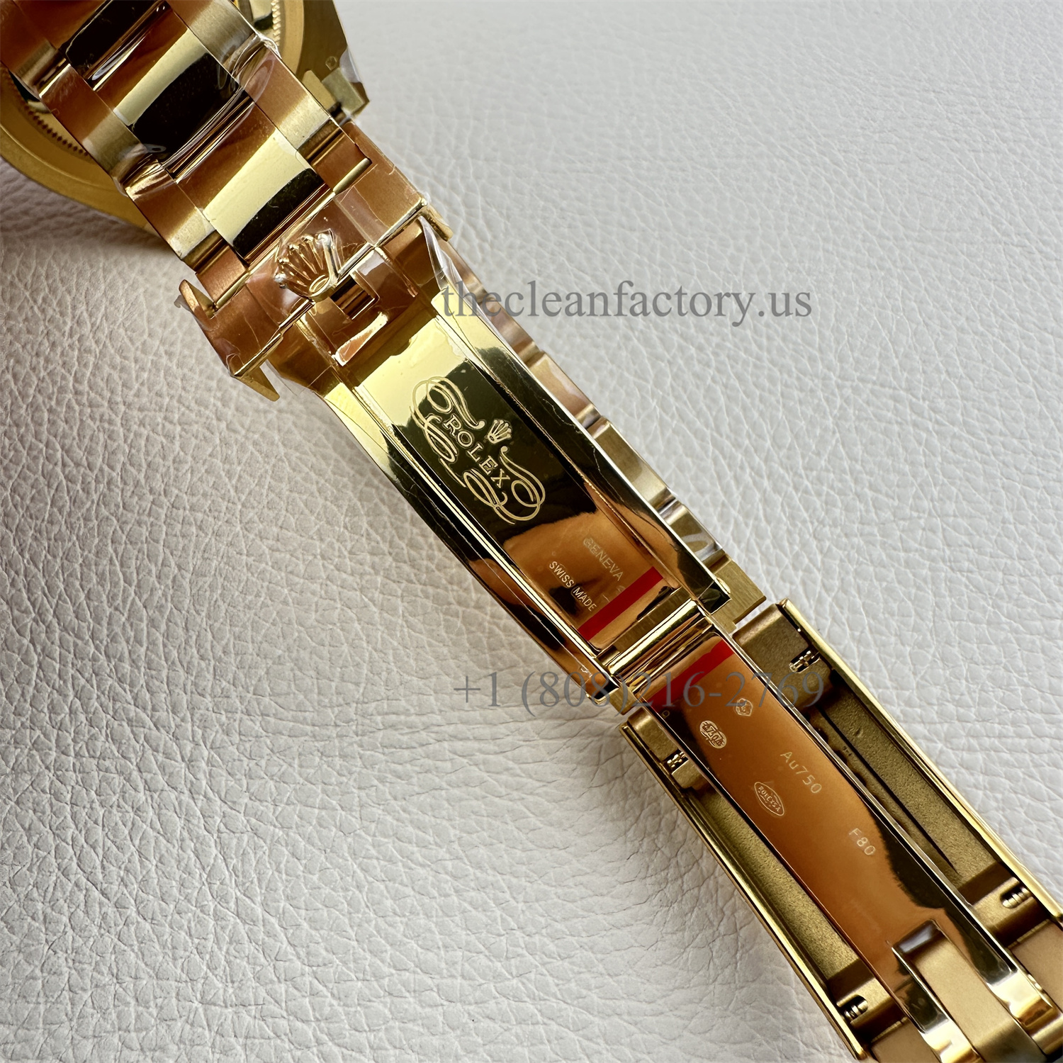 - Il Clean Factory 126618LN ottiene ciò che gli altri sbagliano: l'oro. Non è quel giallo ottone ovviamente falso che urla "replica". Il processo esclusivo di Clean Factory utilizza prima un rivestimento PVD avanzato, poi applica un vero rivestimento in oro 18K sopra. Il risultato è perfettamente abbinato al colore dell'oro Rolex autentico, con il vantaggio cruciale che non sbiadirà, non si macchierà o non si consumerà con il tempo.