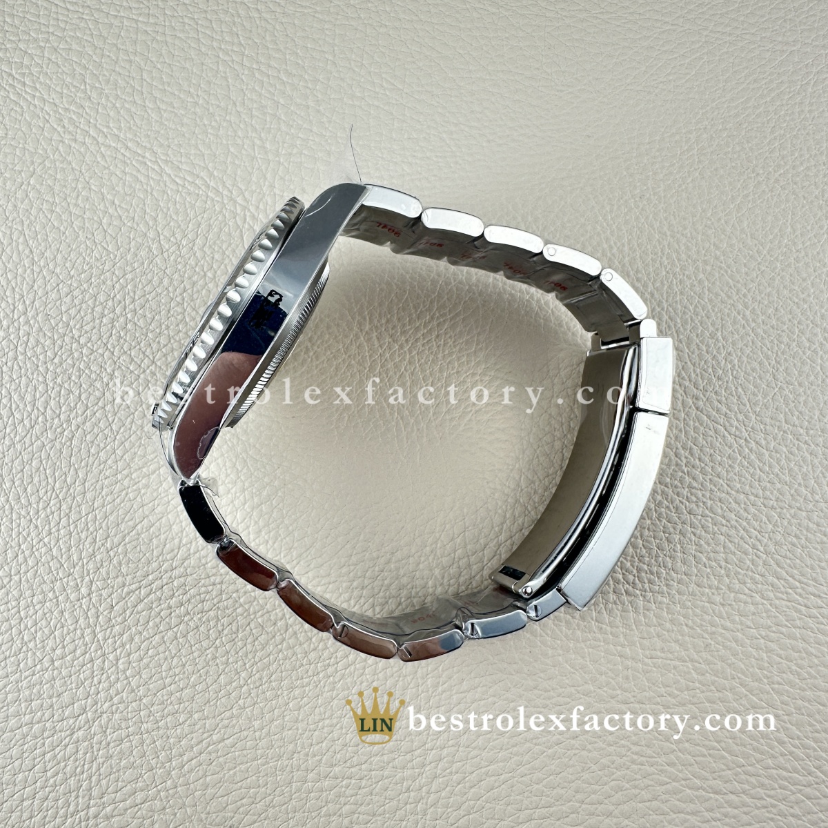 - The deep black dial presents a subtle interplay of light and shadow, with crisp white gold-like indices that catch and reflect light in the same distinctive manner as the genuine article. The handset, flawlessly proportioned and filled with premium Chromalight luminous material, glows with the same characteristic blue tone as the original. The ceramic bezel — with its platinum-filled numerals and precise 120-click rotation — offers the perfect tactile experience, with each click feeling deliberate and secure, exactly as Rolex intended.