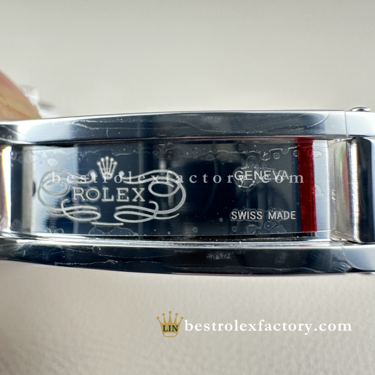 - Perfect “Rolex Rolex Rolex” rehaut engraving with exact alignment to hour markers