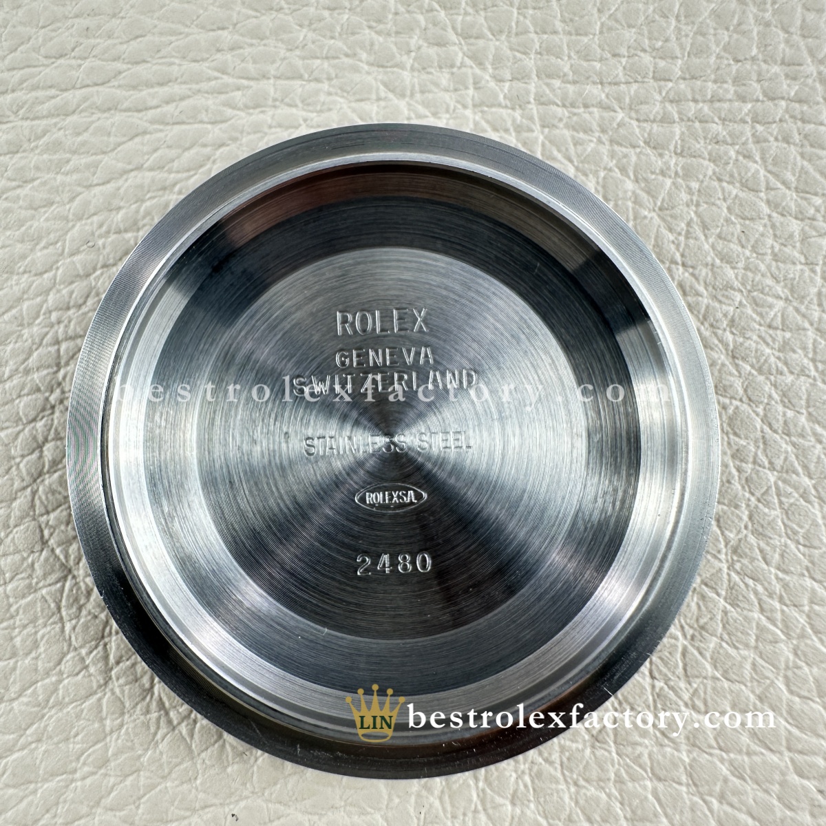 - La lente Cyclops ingrandisce la data di 2,5 volte in modo perfettamente centrato. I numeri rispettano le specifiche Rolex in forma e spessore. Il vetro zaffiro include la corona incisa a laser alle ore 6, prova di attenzione ai minimi dettagli.