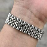 - Il bracciale Jubilee rafforza l’estetica raffinata. La costruzione a cinque maglie scorre con fluidità offrendo il comfort distintivo. Le maglie esterne lucide si contrappongono perfettamente alle sezioni centrali satinate, aggiungendo interesse visivo senza appesantire il quadrante sobrio. Ogni dettaglio è rifinito con precisione, perché su un quadrante essenziale qualsiasi imperfezione è più evidente.