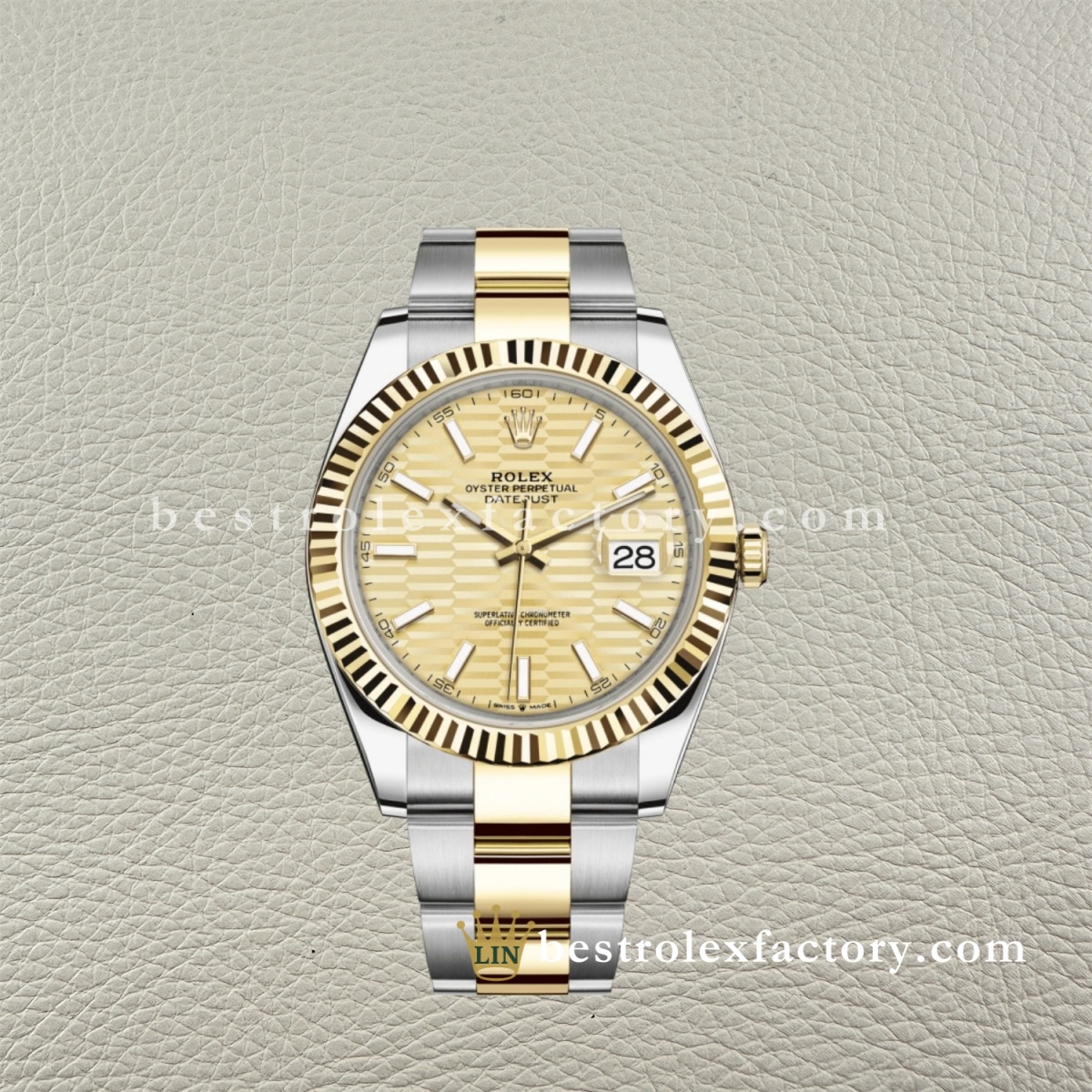 - At 41mm, this configuration delivers substantial wrist presence that feels refined rather than ostentatious. The combination of champagne and yellow gold radiates traditional luxury, especially in business settings where understated elegance is appreciated. The fluted theme provides visual cohesion, while the Oyster bracelet offers durability and comfort for everyday wear.