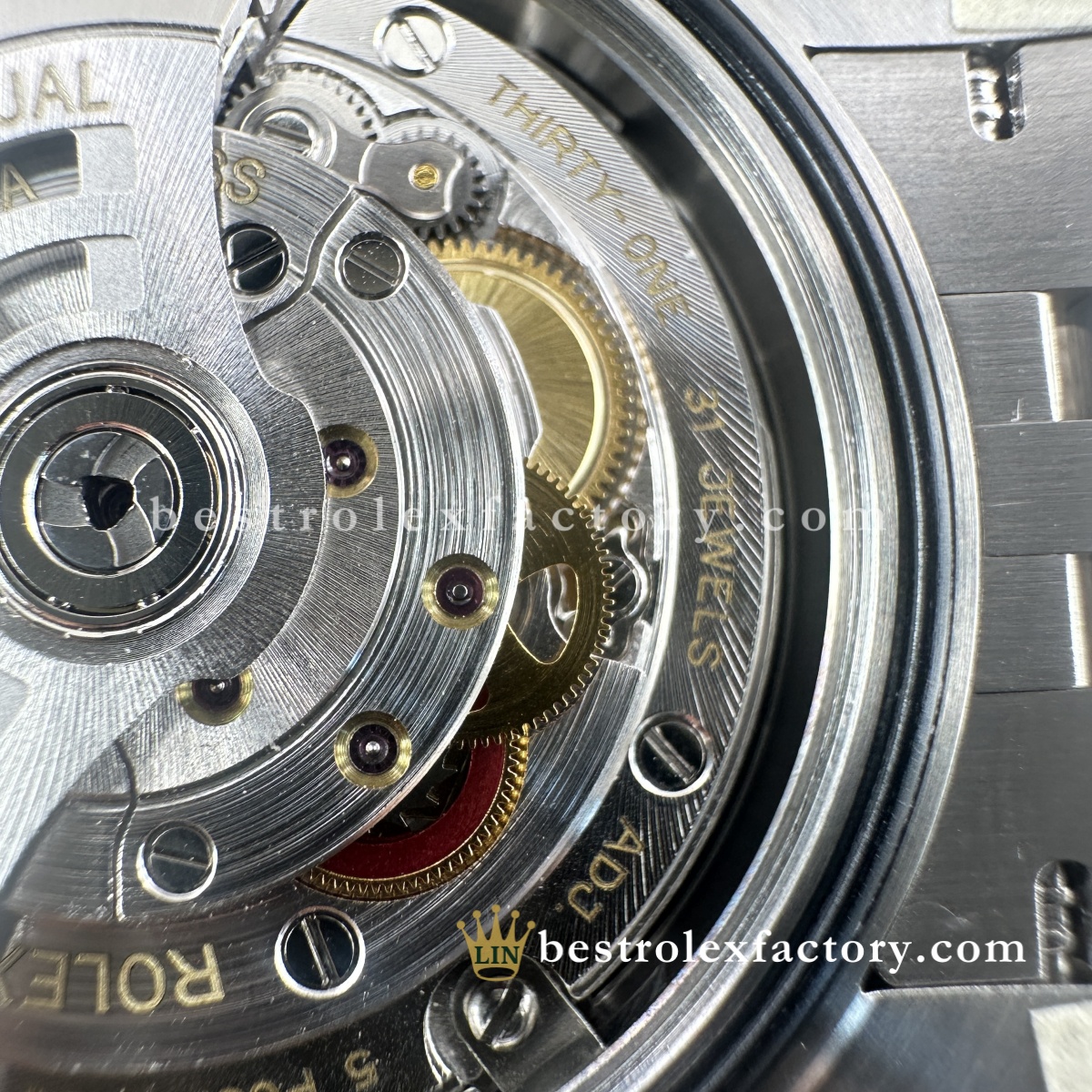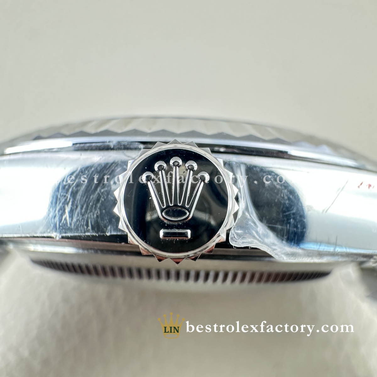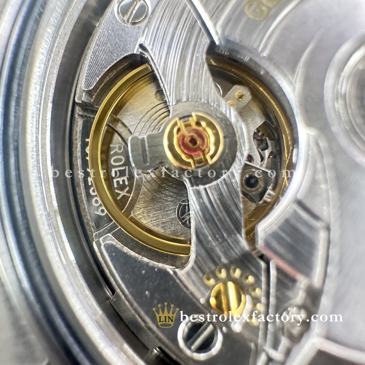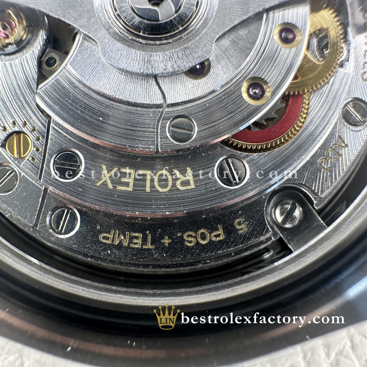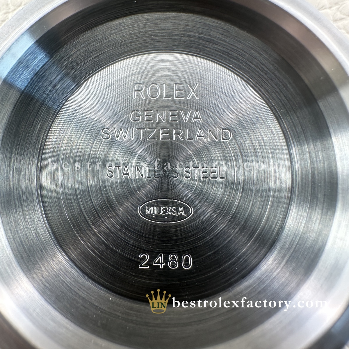 - Il vetro zaffiro integra una lente Cyclops con ingrandimento reale 2,5x, perfettamente centrata. Le cifre della data rispettano forma e proporzioni originali Rolex. La corona laser a ore 6 è incisa con precisione e nella profondità corretta.