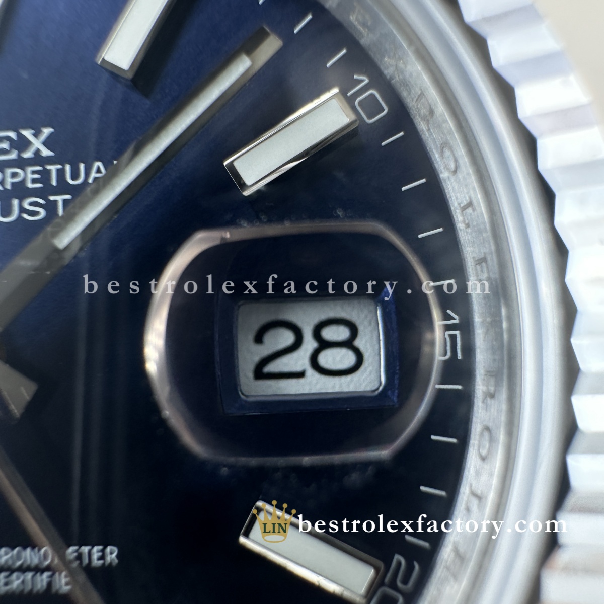 - Il quadrante blu Sunburst acquista ancora più carattere grazie al bracciale Jubilee. La finitura Clean Factory conferisce una profondità e una vivacità che cambiano delicatamente con la luce, mentre l’aspetto formale del bracciale esalta la raffinatezza dell’orologio. La palette cromatica fredda – quadrante blu e lunetta in oro bianco – si abbina perfettamente alle superfici lucide e satinate del Jubilee. Alla luce artificiale risulta sobria e professionale, mentre alla luce naturale il blu rivela la sua brillantezza, incorniciato dalla combinazione di oro bianco e Jubilee.