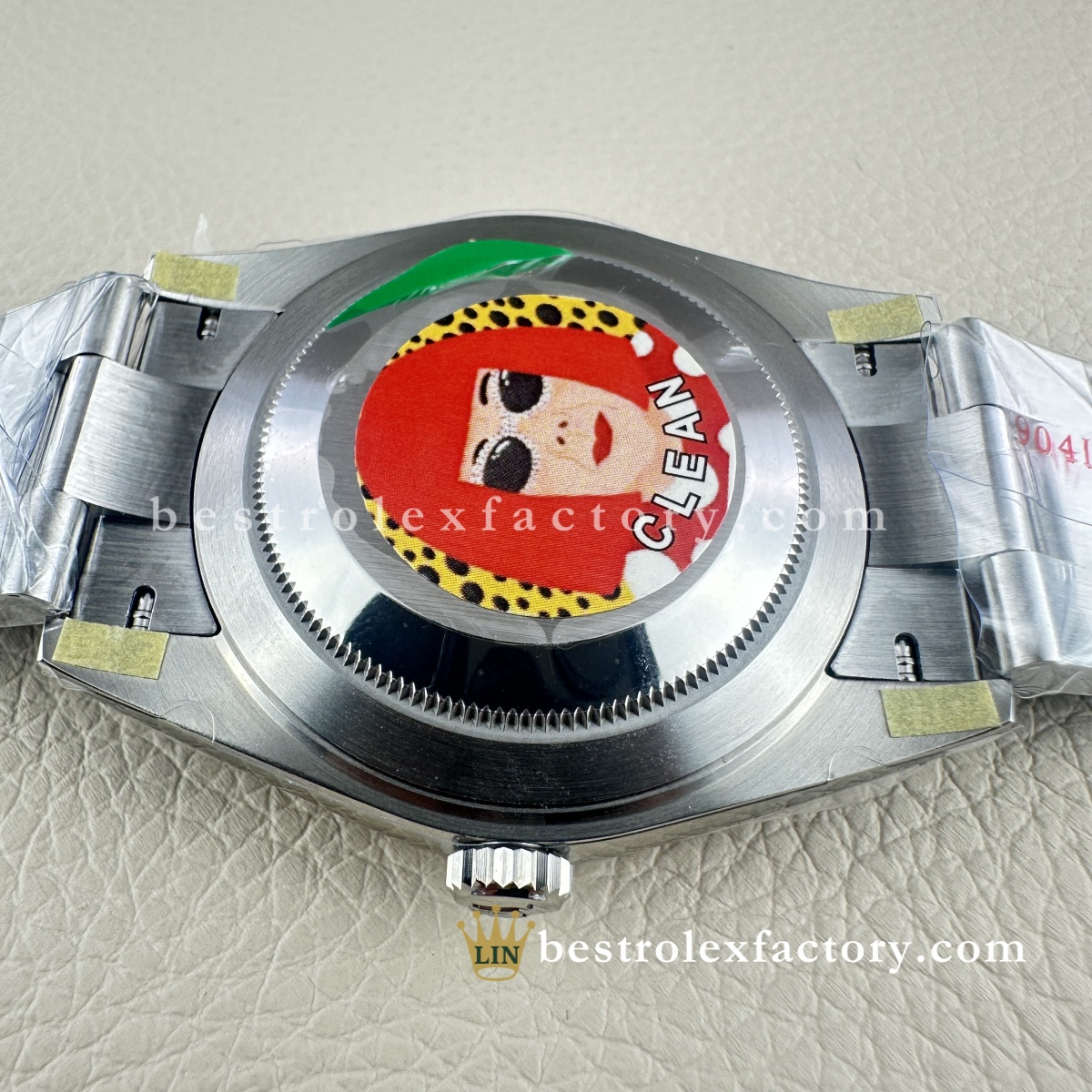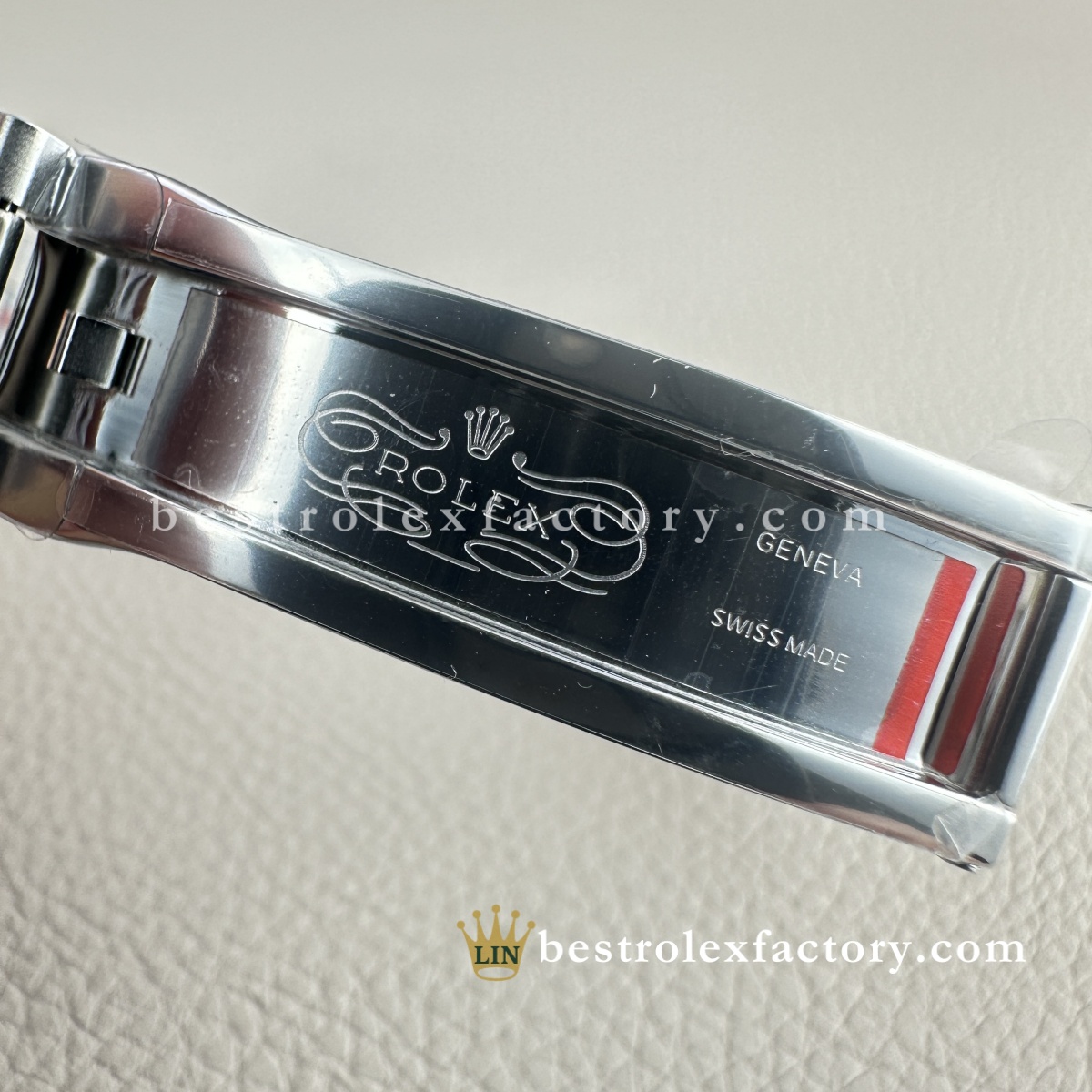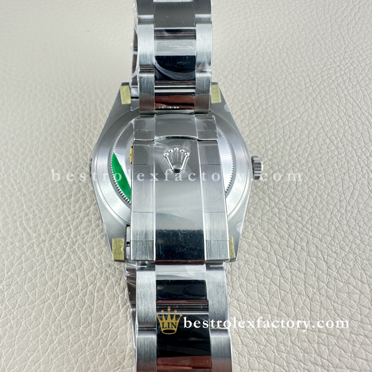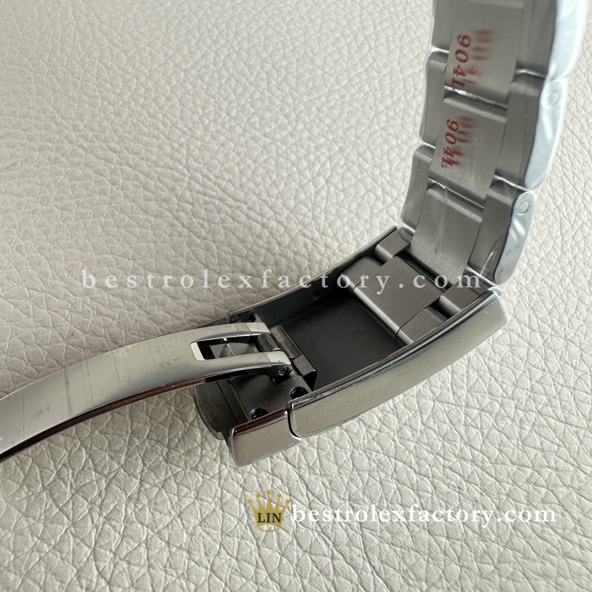 - Il bracciale Oyster dona un aspetto più sostanzioso rispetto al Jubilee. Molte repliche sbagliano le proporzioni delle maglie o hanno una sensazione vuota, ma in questo modello la costruzione a tre pezzi è identica a quella di Rolex. Le maglie esterne satinate e le centrali lucidate hanno una finitura praticamente indistinguibile dall’originale. Persino la chiusura Oysterclasp si chiude con quella morbidezza e il caratteristico “clic” tipico di Rolex.