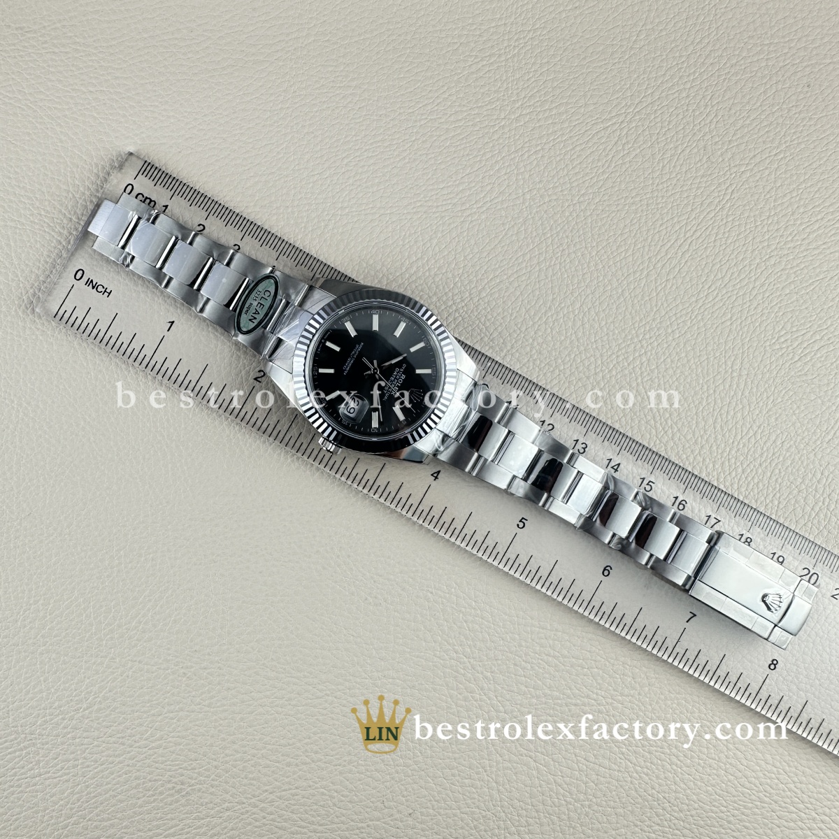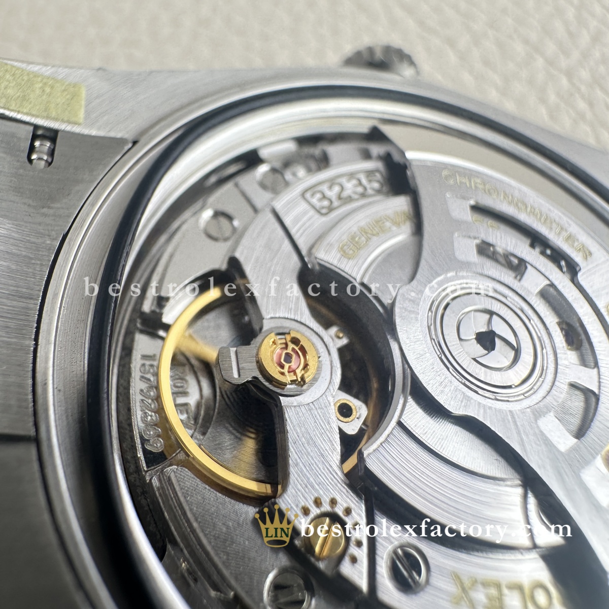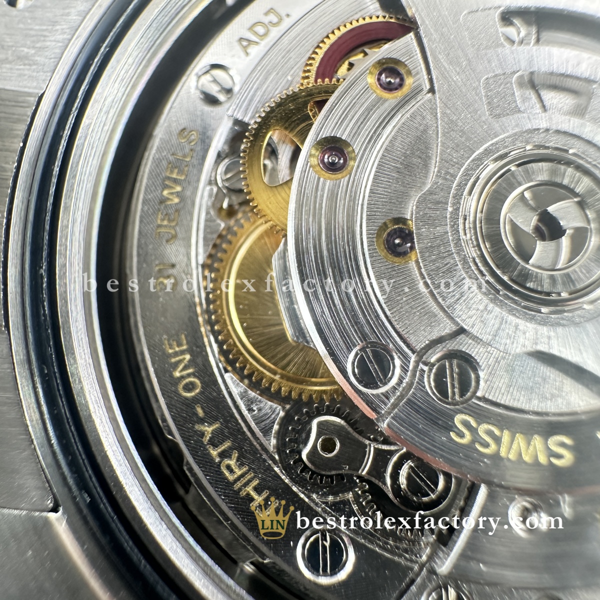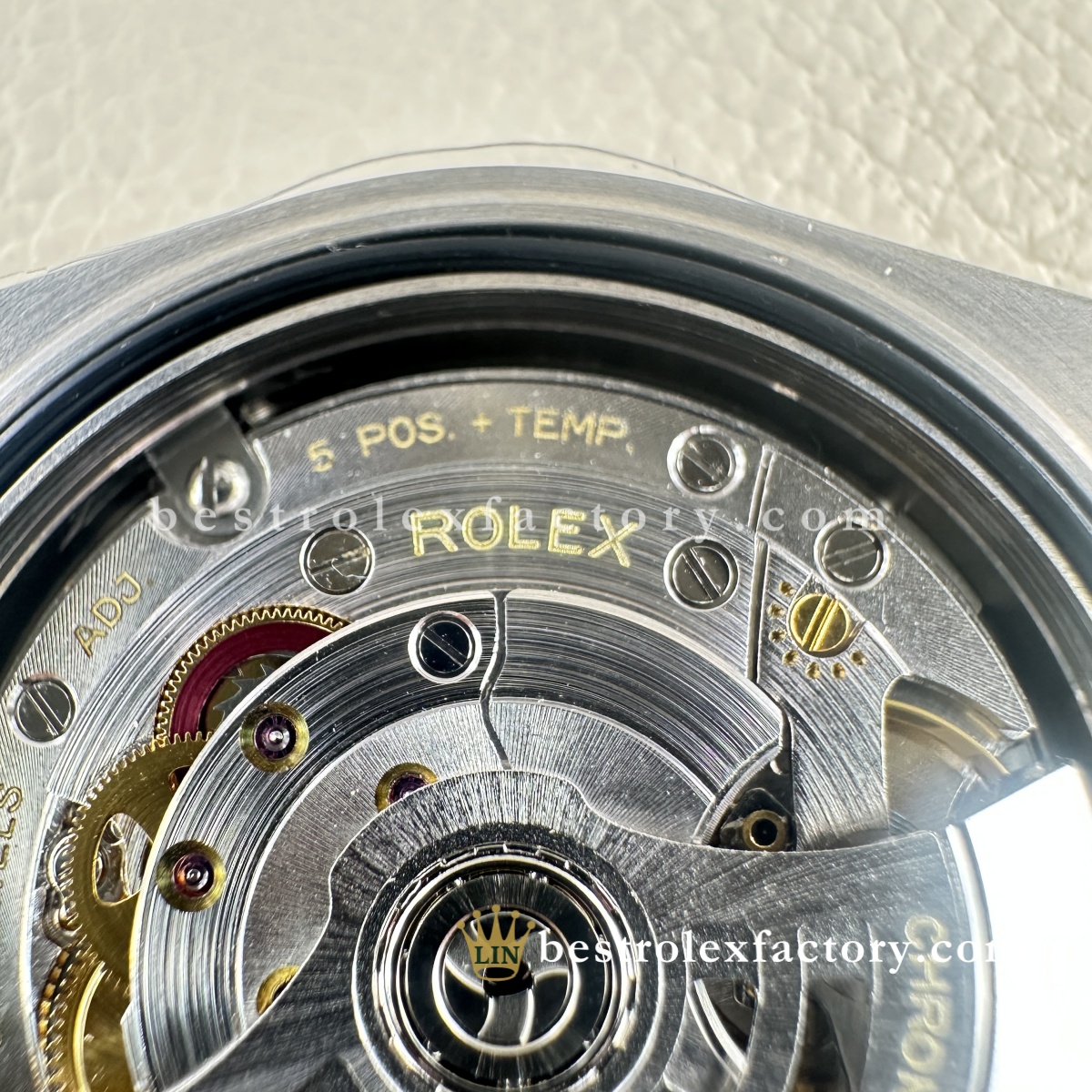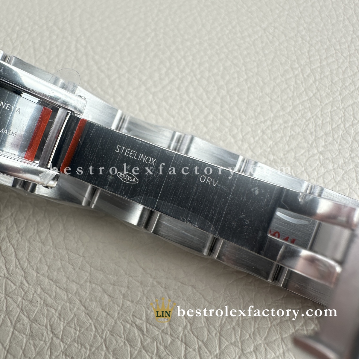 - Il bracciale Oyster dona un aspetto più sostanzioso rispetto al Jubilee. Molte repliche sbagliano le proporzioni delle maglie o hanno una sensazione vuota, ma in questo modello la costruzione a tre pezzi è identica a quella di Rolex. Le maglie esterne satinate e le centrali lucidate hanno una finitura praticamente indistinguibile dall’originale. Persino la chiusura Oysterclasp si chiude con quella morbidezza e il caratteristico “clic” tipico di Rolex.