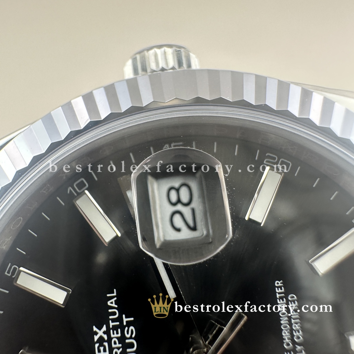 - Gli indici applicati sono un altro dettaglio in cui molte repliche non riescono a essere convincenti. Qui, ogni indice è posizionato singolarmente all’altezza corretta e lucidato alla perfezione. Quando la luce colpisce le facce sfaccettate, l’effetto è identico a quello di un Rolex autentico. La finestra della data presenta bordi netti e puliti, e i numeri neri non solo hanno il colore esatto: conservano forma, dimensione e proporzioni corrette. Anche il rapporto tra altezza delle cifre e dimensione dell’apertura corrisponde al Rolex originale.