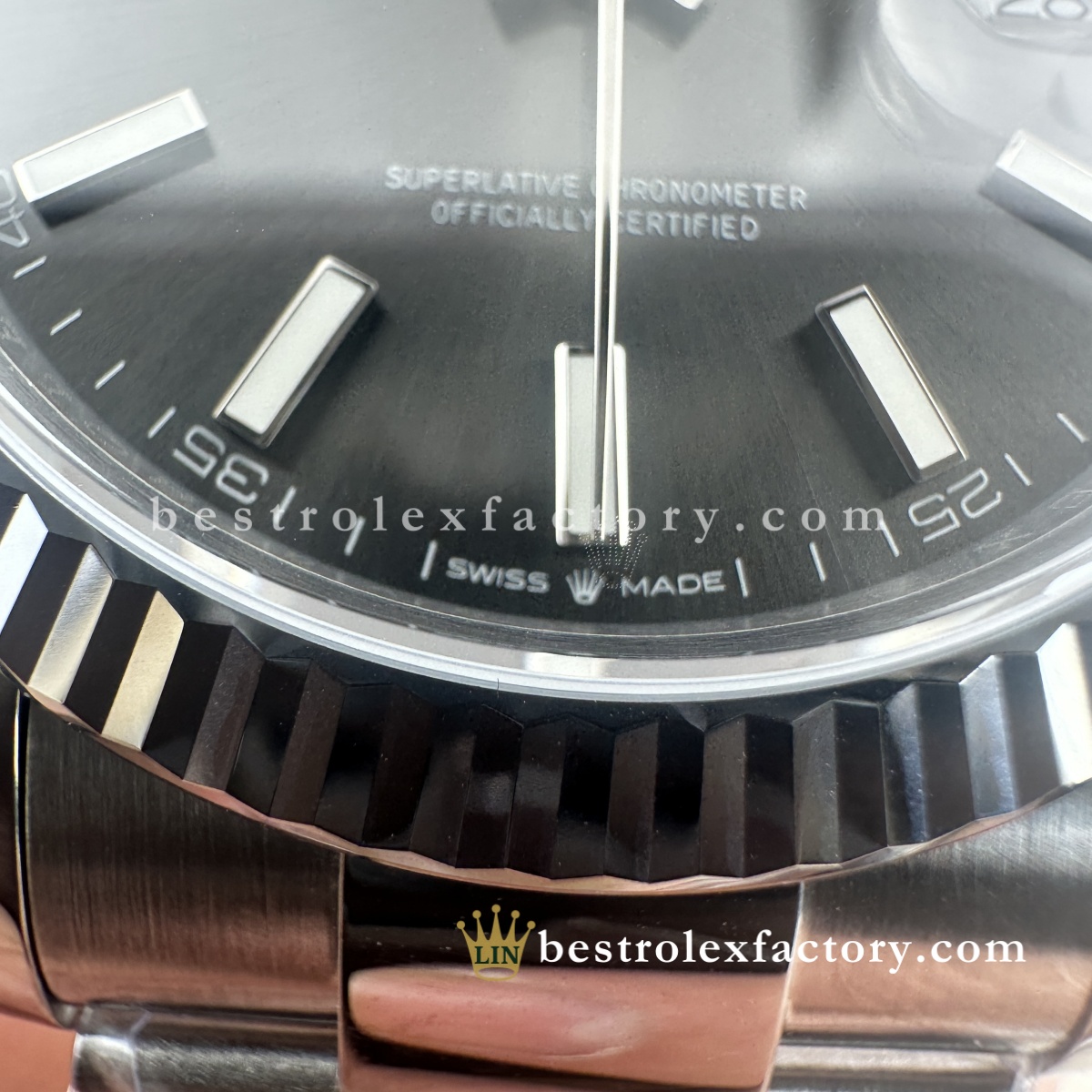 - Il quadrante grigio con finitura sunburst è il punto in cui la maggior parte dei produttori fallisce. O risulta troppo scuro, con un aspetto metallico spento, oppure troppo chiaro e sembra economico e poco profondo. Clean Factory ha ottenuto l’esatta tonalità grigio argento utilizzata da Rolex, con quel carattere metallico che cambia sottilmente sotto diverse luci. La satinatura radiale parte con precisione dal centro e ha la grana perfetta: né troppo grossa come nelle imitazioni economiche, né così fine da perdere profondità.