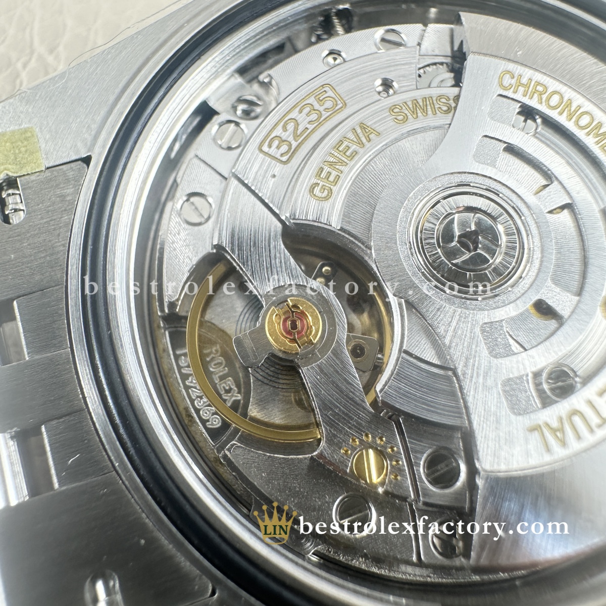 • Il movimento clone 3235 rappresenta il massimo della replica meccanica: cambio data istantaneo a mezzanotte, carica con la stessa resistenza dell’originale e micro-incisioni identiche sui ponti e sul rotore.