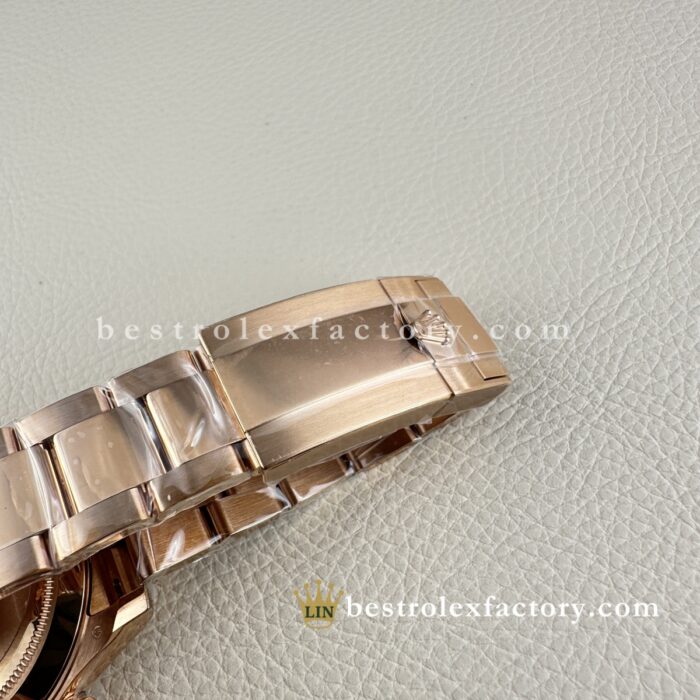 • Il quadrante Sundust è il vero protagonista. Non è un colore piatto—è una finitura testurizzata piena di minuscole particelle cristalline che catturano e riflettono la luce in un modo che nessun altro quadrante riesce a fare. La base calda rame-rosata cambia angolazione dopo angolazione, a volte opaca, a volte metallica, a volte quasi scintillante—ma sempre di un’eleganza impeccabile. È la finitura più dinamica che Rolex abbia mai creato.