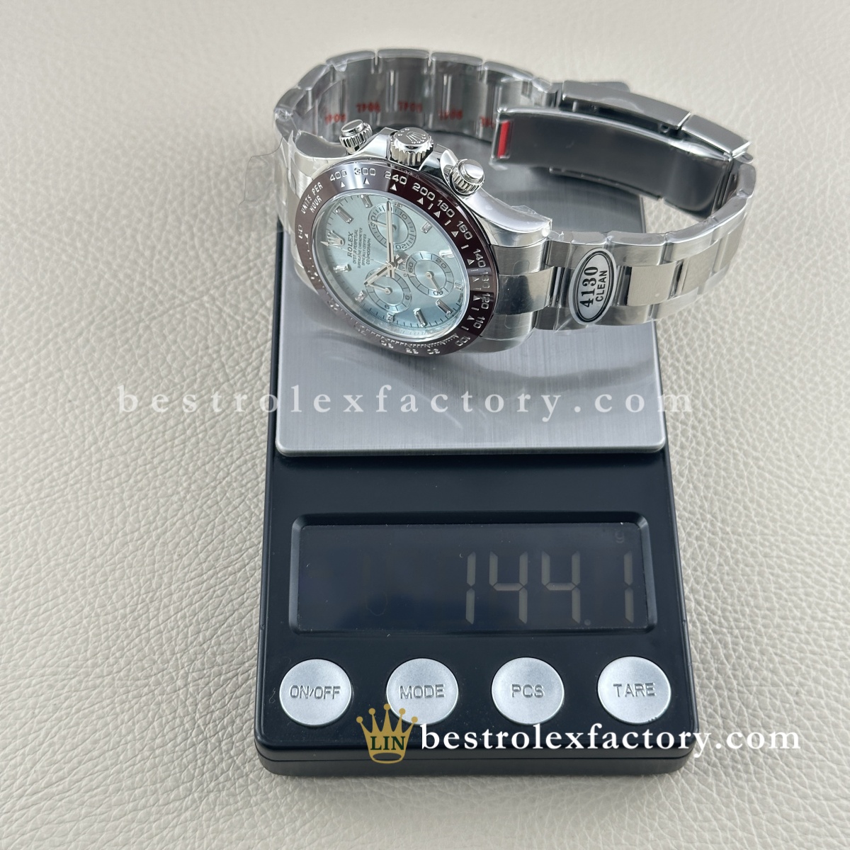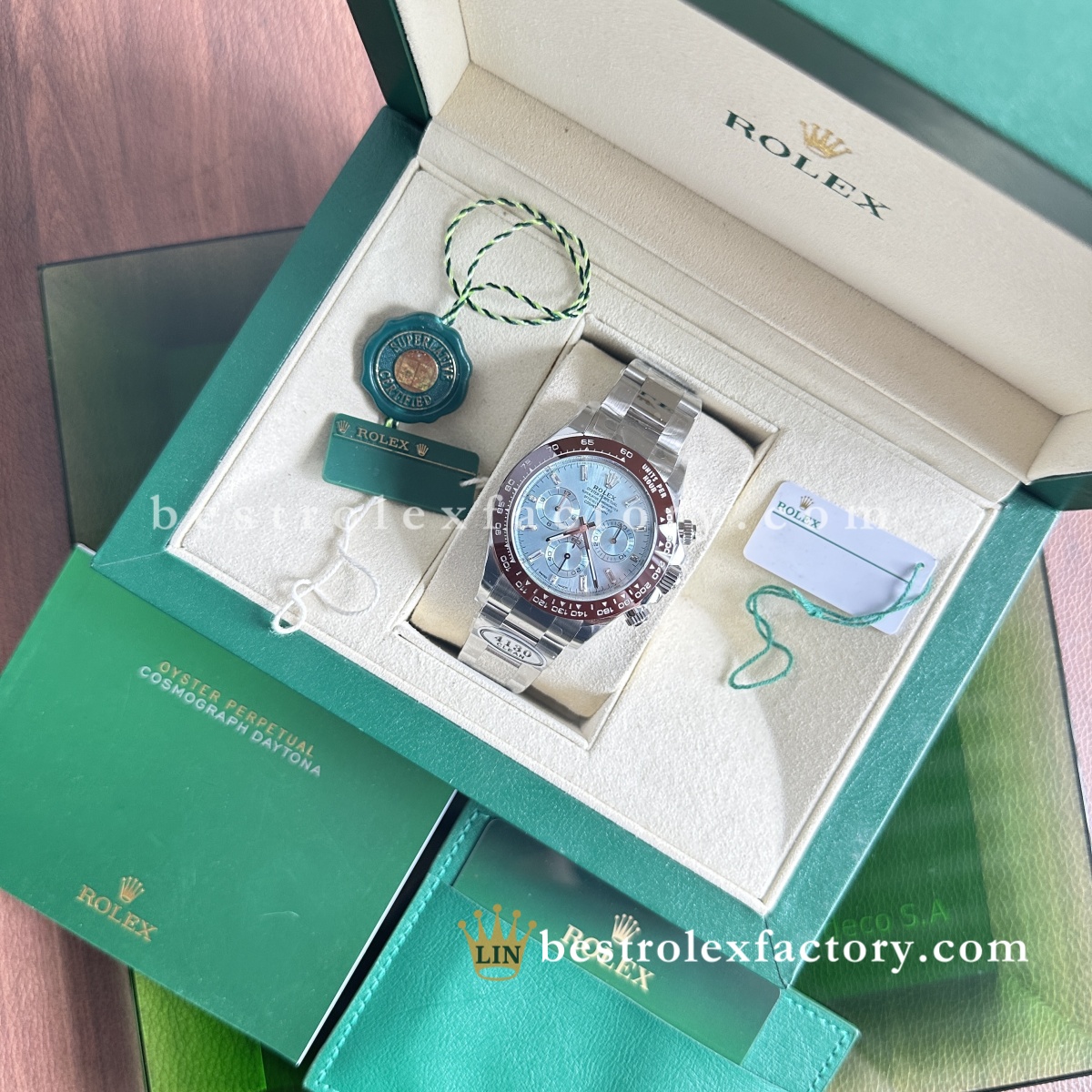 - Clean Factory lo garantisce completamente, consapevole della qualità superiore. Per chi desidera la configurazione più rara del Daytona—quadrante Ice Blue, lunetta in ceramica marrone e indici baguette—questa è la versione definitiva senza dover spendere sei cifre.