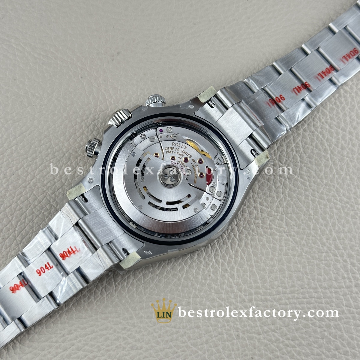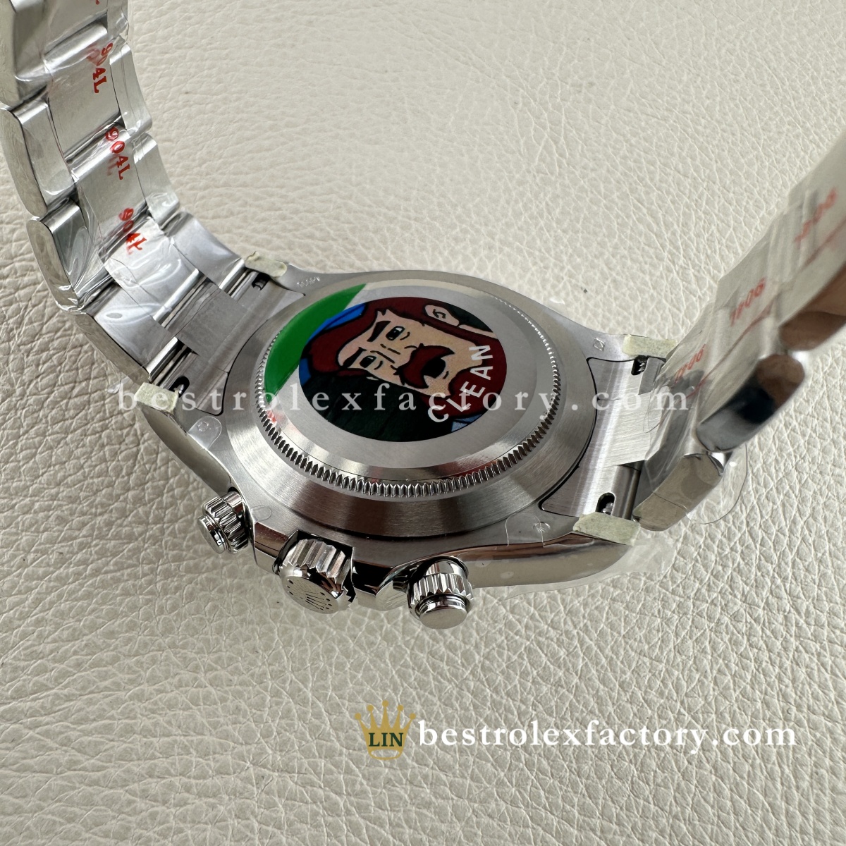 - Le dimensioni restano quelle classiche del Daytona: 40mm di diametro e 12,5mm di spessore. Il peso è di 145g—più leggero del vero platino, perfetto per l’uso quotidiano. Il modello originale con diamanti supera i 200g—impressionante, ma stancante. Qui ottieni lo stesso impatto visivo con maggiore comfort.