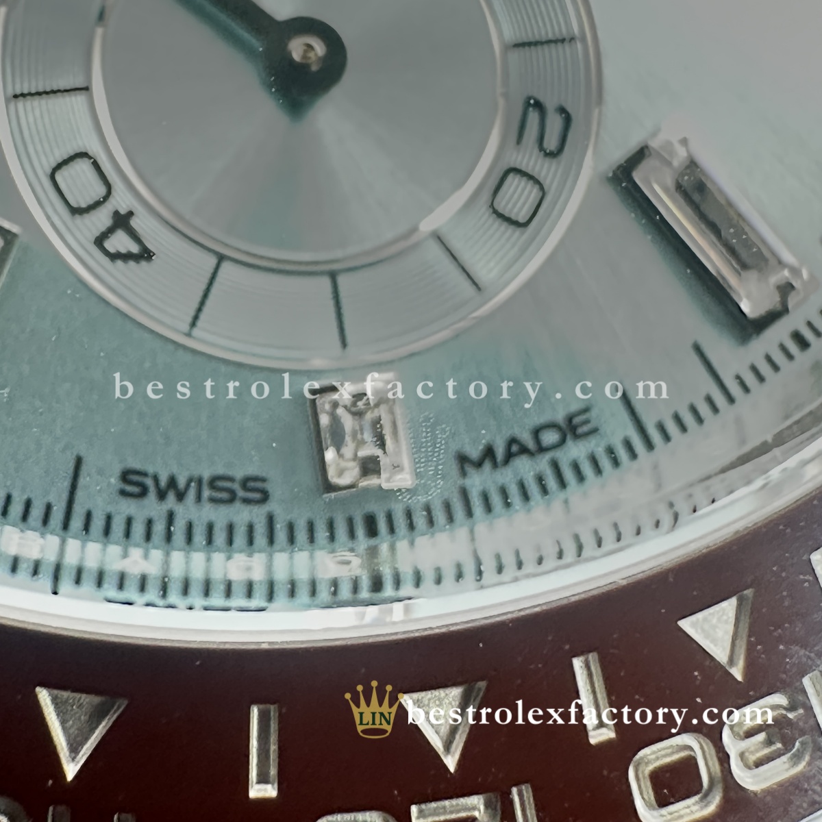 - Il mondo delle repliche di solito fallisce quando prova a combinare tutti questi dettagli: quadranti Ice Blue che diventano azzurro cielo, pietre opache o ceramica marrone sostituita con nero. Clean Factory fa tutto nel modo giusto: colore perfetto, moissanite premium, vera ceramica marrone e incastonatura impeccabile.