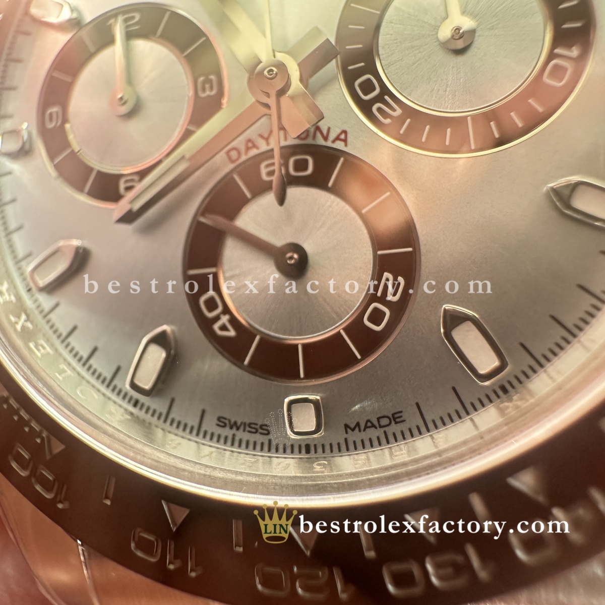 - Il nostro Rolex Daytona 116506-0001 di Clean Factory è l’unicorno dei Daytona. Quadrante ice blue, lunetta in ceramica marrone, stile platino—questa combinazione è talmente esclusiva che la maggior parte delle persone non sa nemmeno che esista. È Rolex che dice “le regole le facciamo noi” e crea qualcosa che non dovrebbe funzionare, ma invece è perfetta.