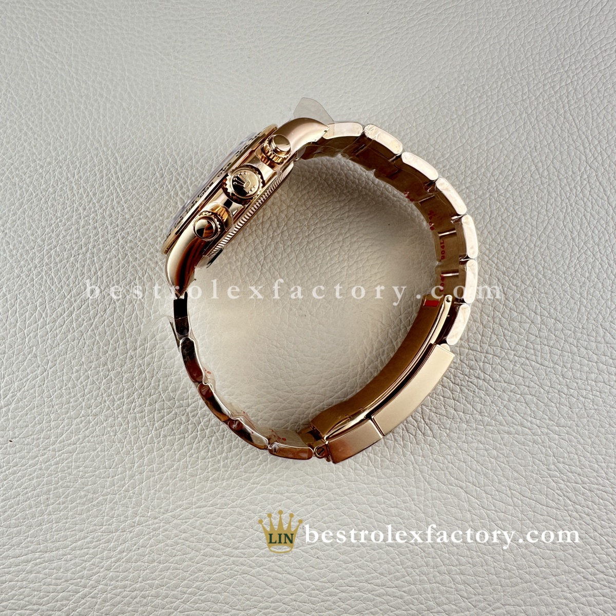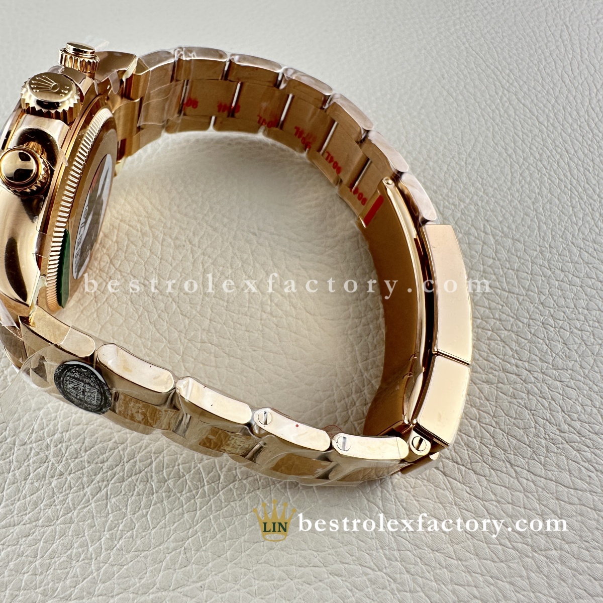 - Con un peso di circa 148 grammi, l’orologio risulta importante senza essere ingombrante. La cassa da 40mm mantiene le proporzioni classiche del Daytona mentre mostra la calda tonalità Everose su ogni superficie.