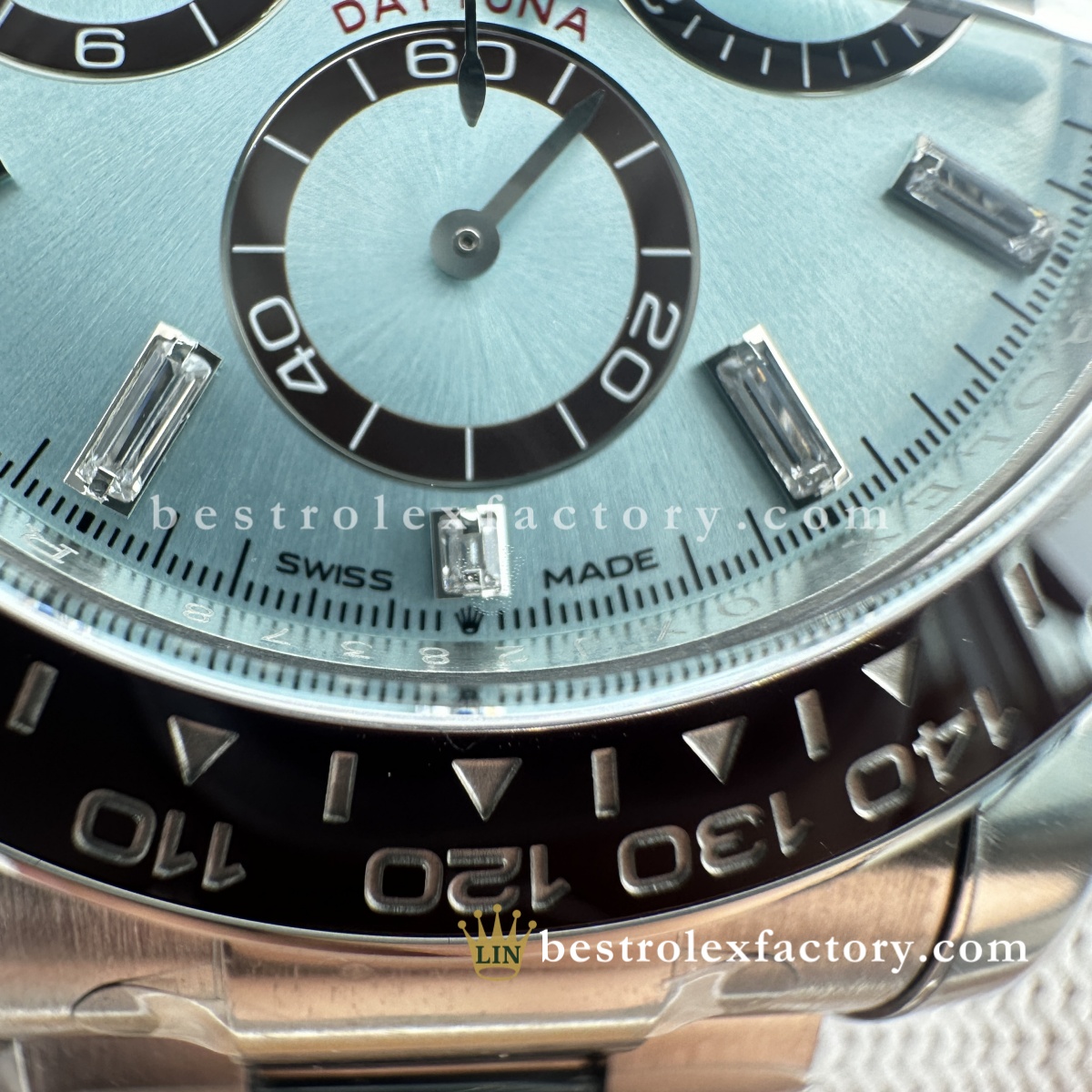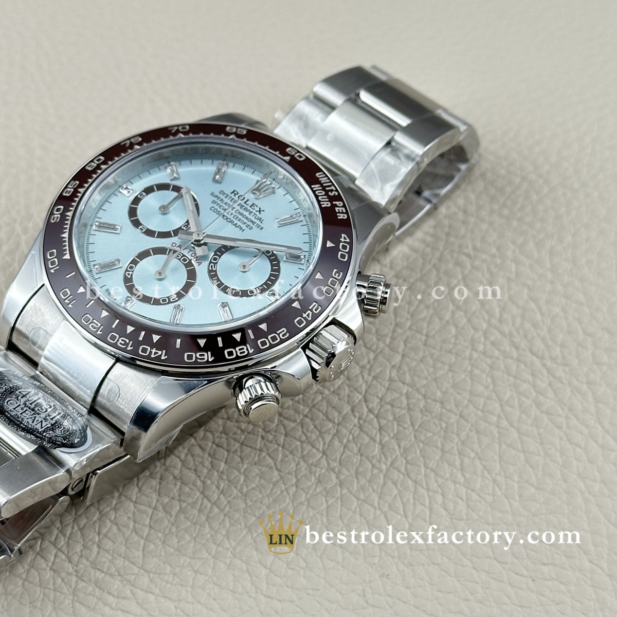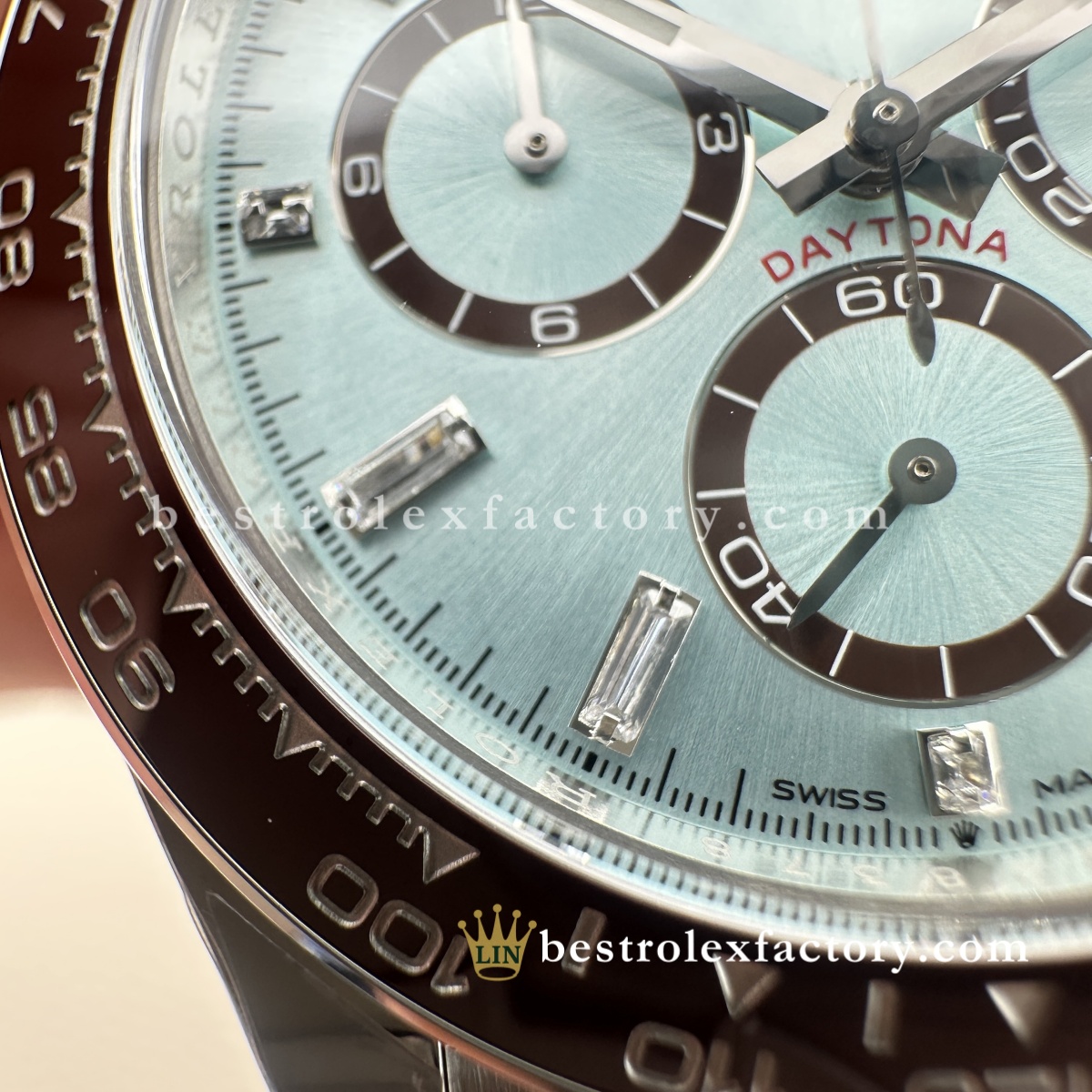 - Il Rolex Daytona 126506-0002 Super Clone di Clean Factory porta la configurazione platino già esclusiva al vertice assoluto del lusso. Quadrante ice blue con diamanti baguette, lunetta in ceramica marrone castagna e fondello espositivo: questo è il Daytona che dimostra che Clean Factory non si limita a replicare gli orologi, ma li perfeziona. Quando altri produttori non tentano nemmeno un semplice quadrante ice blue, Clean Factory lo realizza con diamanti baguette impeccabili.