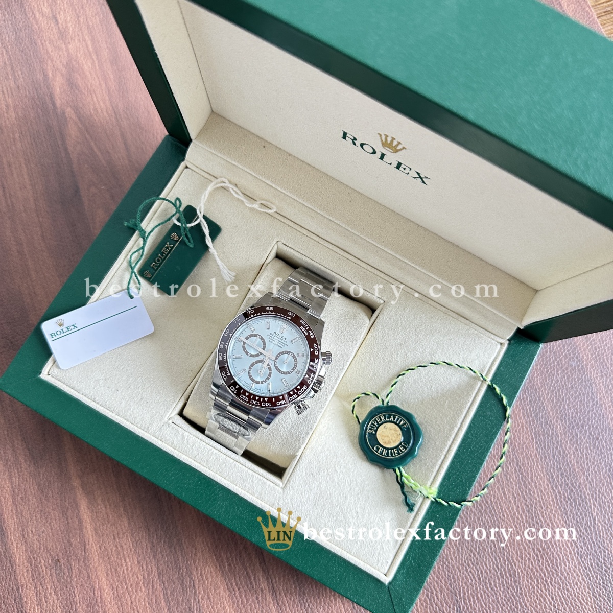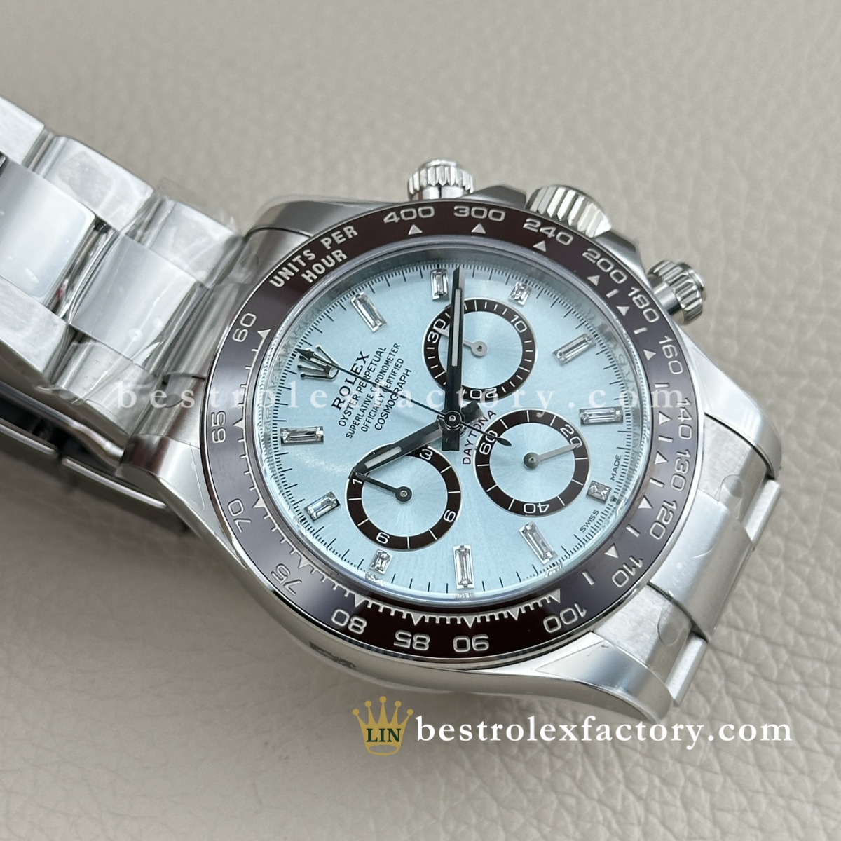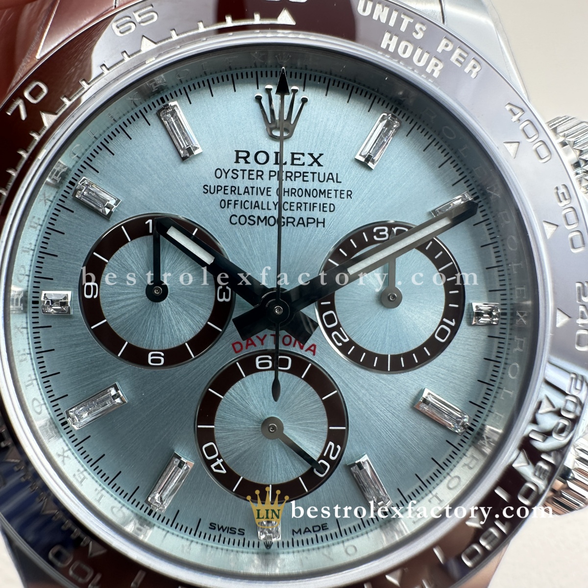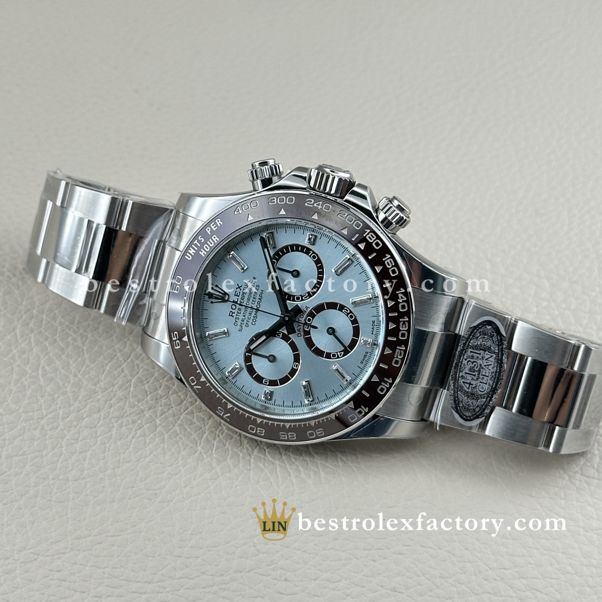 - Il Rolex Daytona 126506-0002 Super Clone di Clean Factory porta la configurazione platino già esclusiva al vertice assoluto del lusso. Quadrante ice blue con diamanti baguette, lunetta in ceramica marrone castagna e fondello espositivo: questo è il Daytona che dimostra che Clean Factory non si limita a replicare gli orologi, ma li perfeziona. Quando altri produttori non tentano nemmeno un semplice quadrante ice blue, Clean Factory lo realizza con diamanti baguette impeccabili.