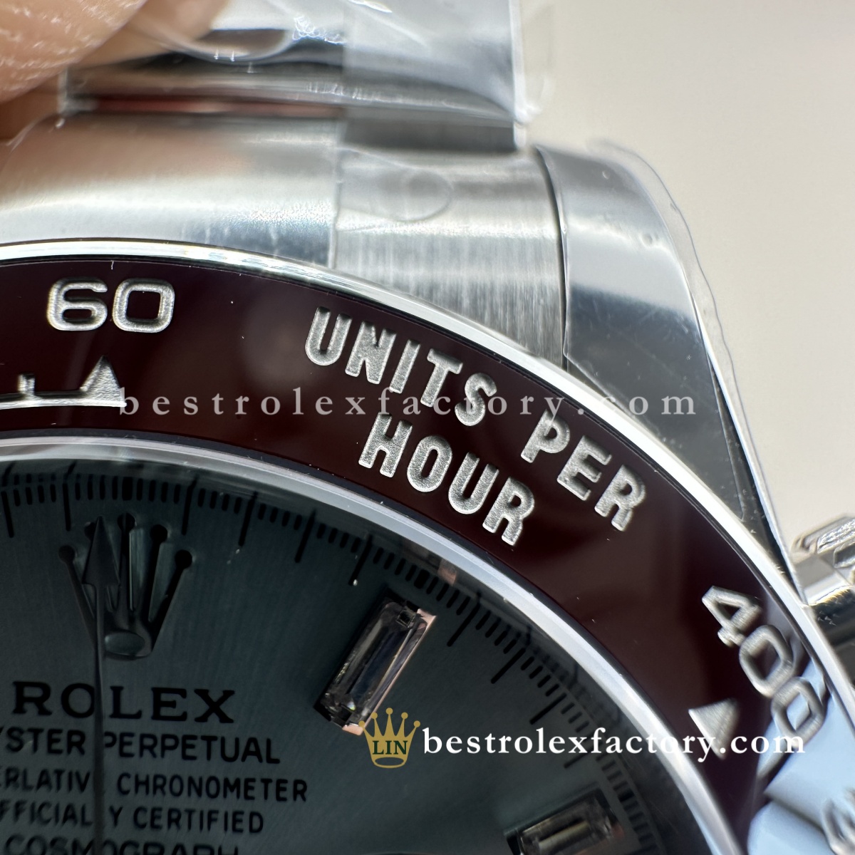 - La lunetta in ceramica marrone castagna aggiunge un contrasto caldo a tutta questa brillantezza glaciale. Clean Factory è l’unica azienda ad aver replicato con successo questa tonalità Rolex precisa. Non è marrone cioccolato, non è beige, ma quello specifico castagna che cambia sfumatura a seconda della luce. Abbinato all’ice blue e ai baguette scintillanti, crea una profondità visiva che nessun altro orologio replica può raggiungere.
