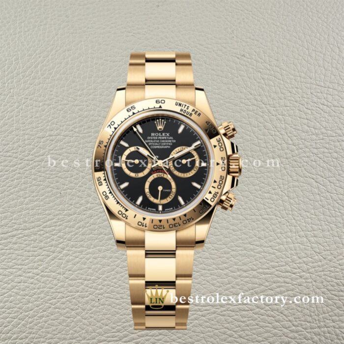- Il Rolex Daytona 126508-0004 di Clean Factory è la definizione del lusso discreto. Cassa e bracciale interamente in oro giallo 18k, un quadrante nero profondo e ricchi contatori dorati si combinano in una configurazione che appare al tempo stesso senza tempo e sofisticata. Questo è il Daytona per i collezionisti che sanno che i classici, realizzati alla perfezione, non passano mai di moda.