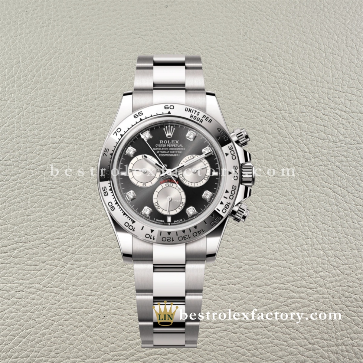 - Il Rolex Daytona 126509-0002 di Clean Factory dimostra che è possibile unire lusso moderno e precisione di livello svizzero. Cassa in oro bianco, quadrante nero profondo, contatori argentati e brillanti diamanti moissanite si combinano in un design che è al tempo stesso sobrio e senza compromessi.