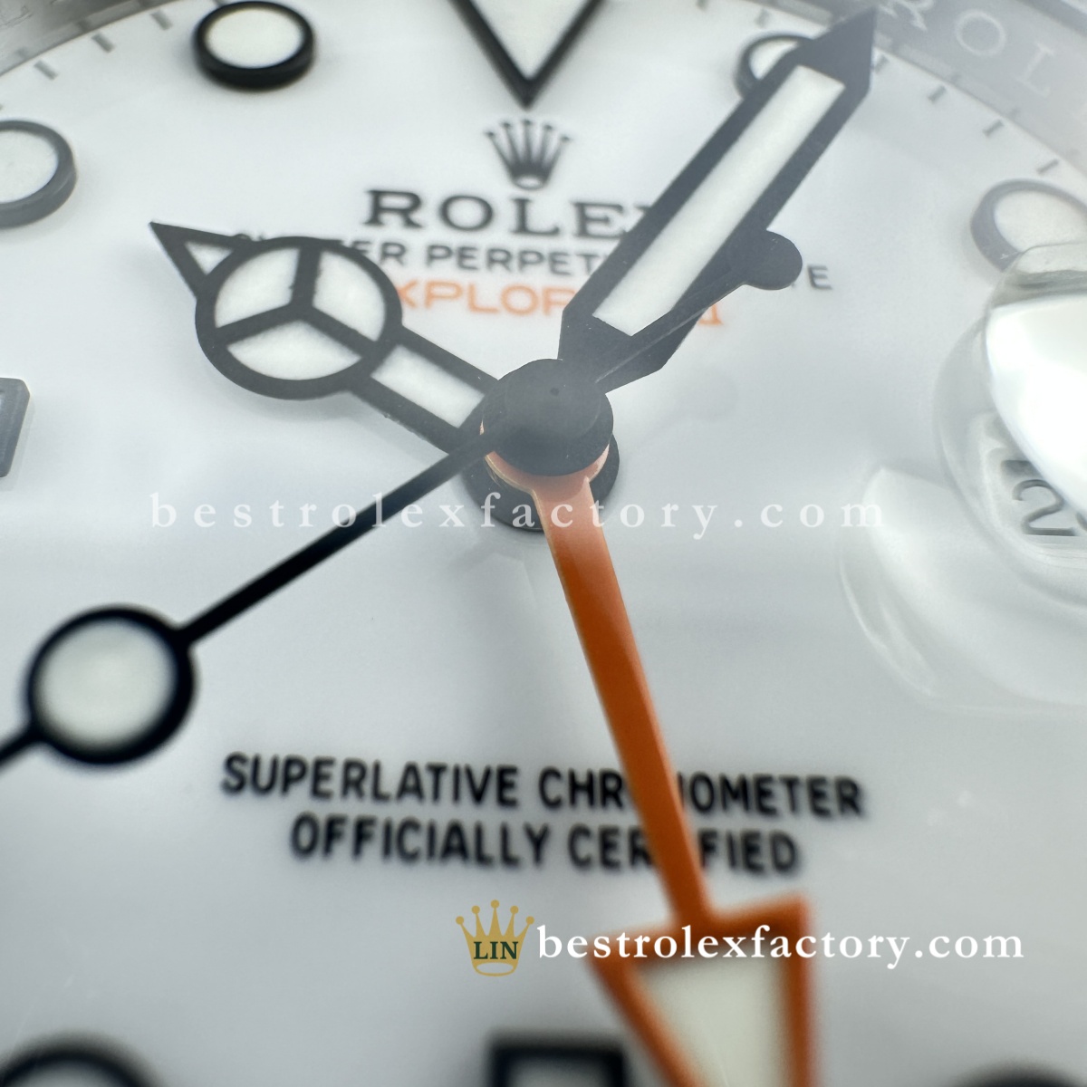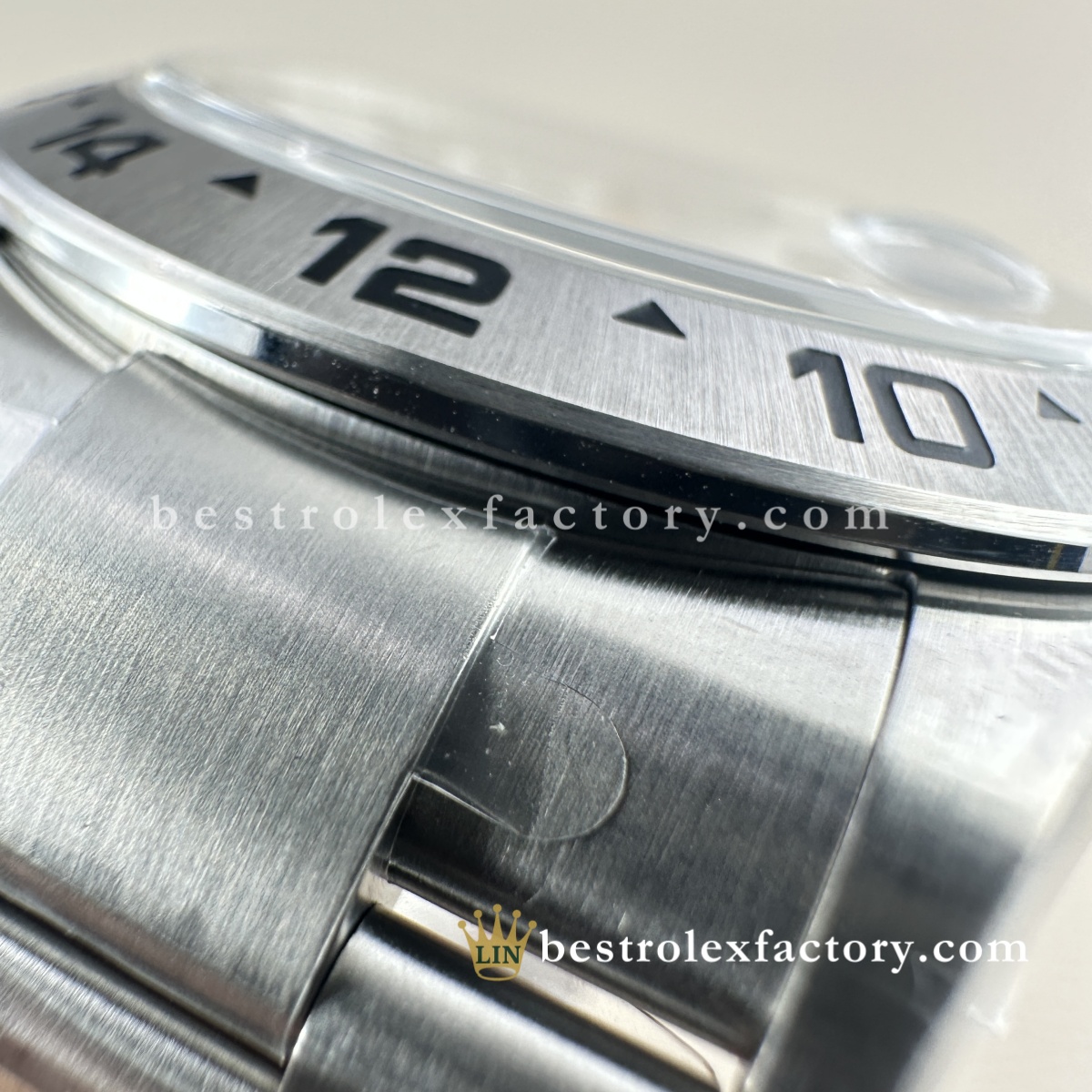- Indici applicati in acciaio. Lancette Mercedes che scorrono perfettamente. La scritta “EXPLORER II” esattamente dove la mette Rolex, con font e spaziatura corretti. Numero modello M226570 inciso nel punto giusto. Numero di serie sul rehaut dove deve stare.