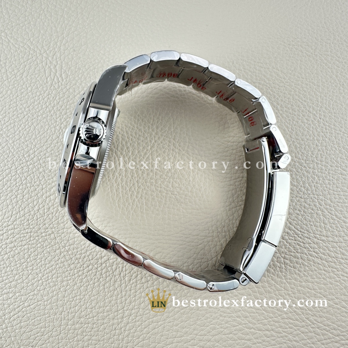 - Cassa da 42mm, quel look classico Explorer. Non troppo grande, non un piatto da portata al polso. Il quadrante bianco, però – è qui che diventa interessante. Pulito. Leggibile. La lancetta GMT arancione risalta esattamente come dovrebbe contro lo sfondo bianco.