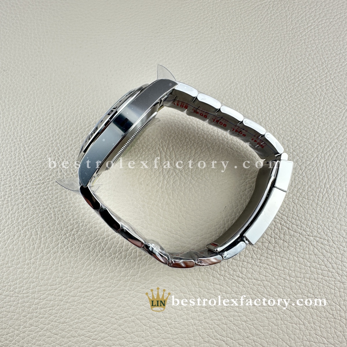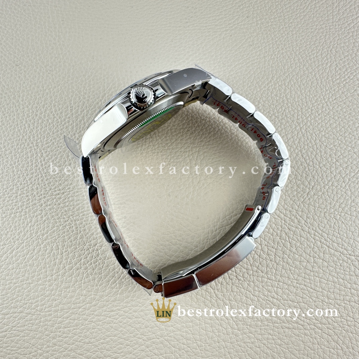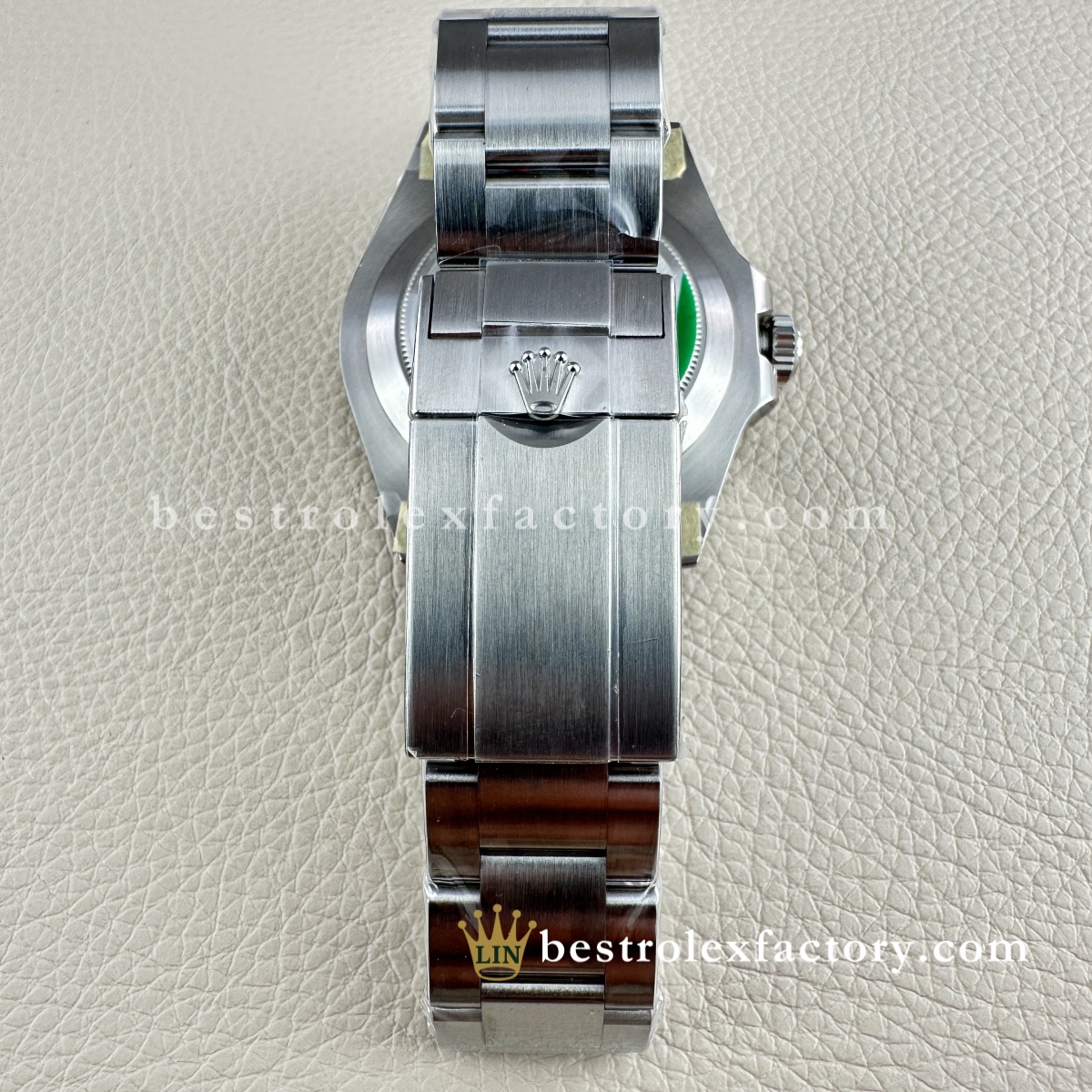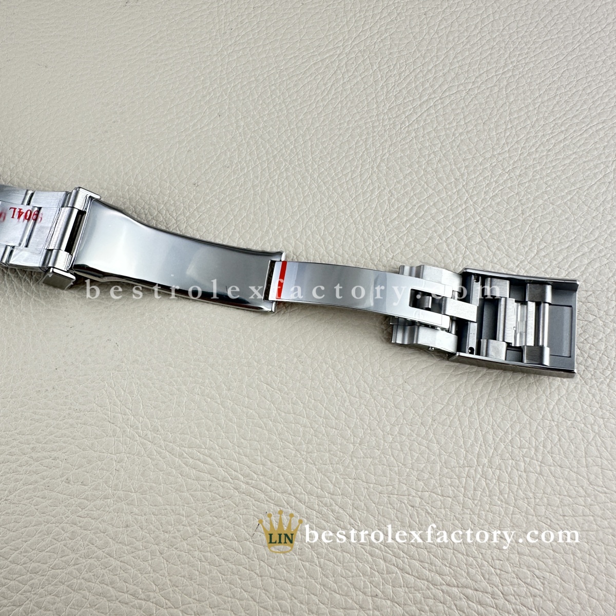 - Cassa in acciaio 904L con satinatura corretta – nessuna superficie lucida che urla “falso”. Lunetta fissa in acciaio con scala 24 ore incisa, pulita e funzionale come dev’essere.