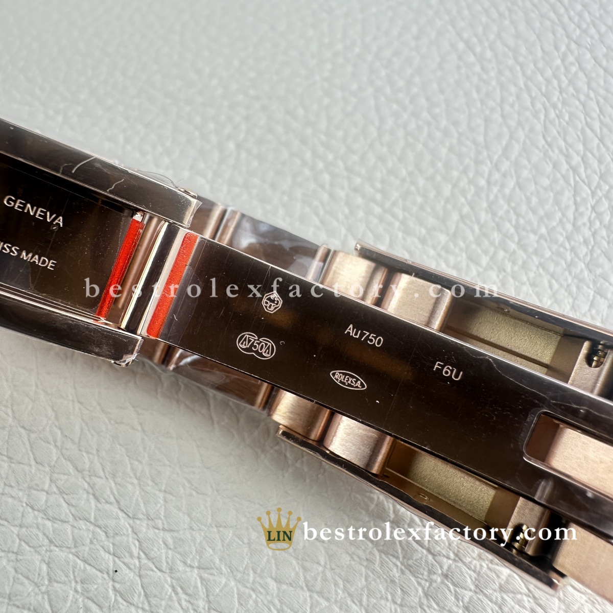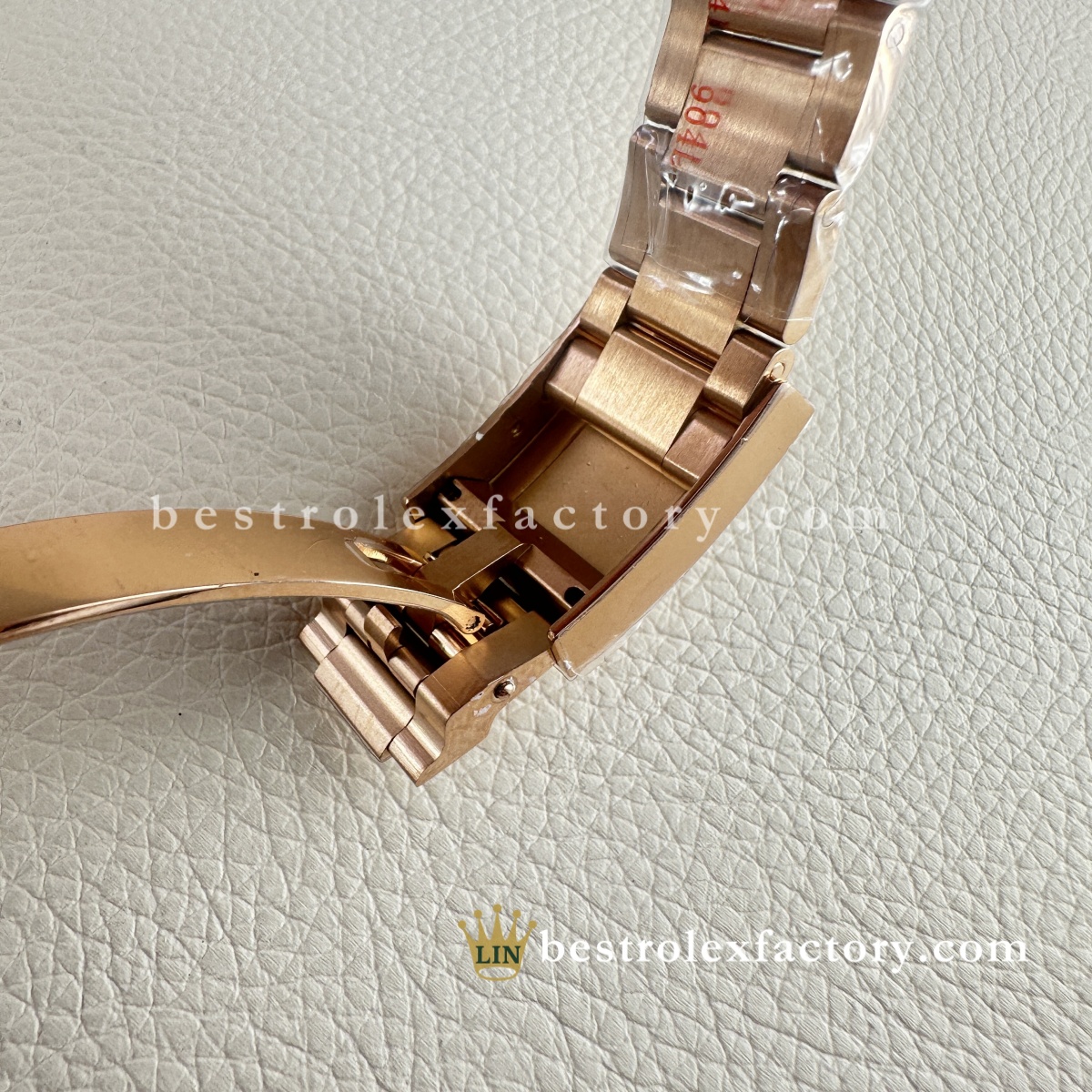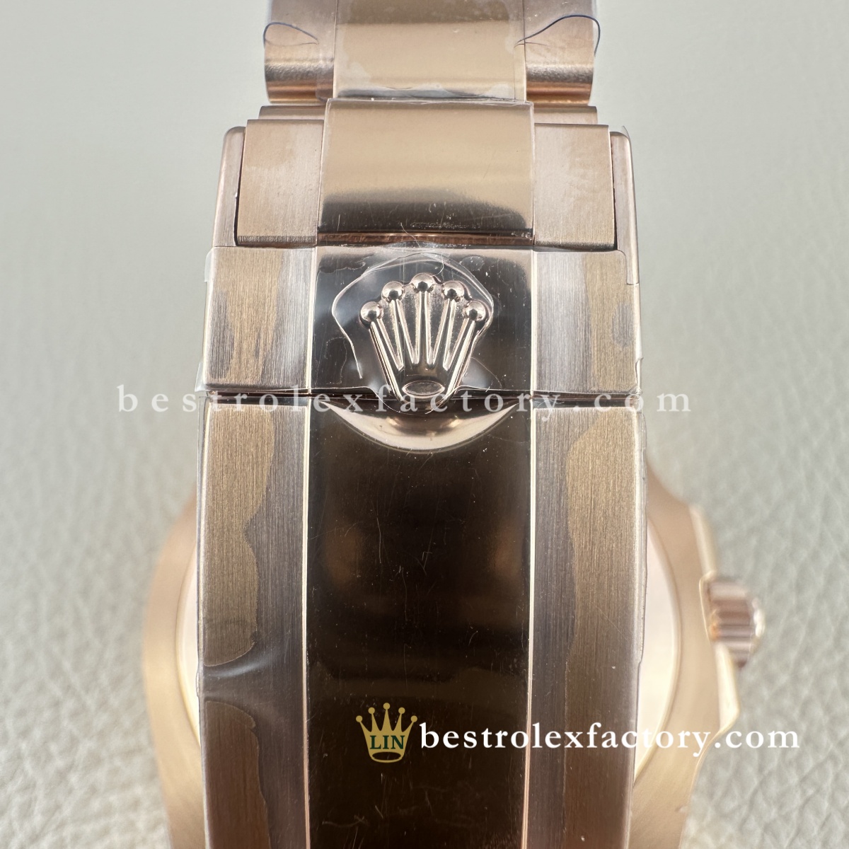 • La cassa da 40mm è proporzionata con cura. Dal profilo delle anse alla forma delle protezioni corona, tutto è fedele all’originale e si adatta bene a polsi di ogni dimensione. Il rivestimento in oro rosa continua su tutte le superfici visibili: ghiera, corona, maglie centrali. Nessun compromesso.