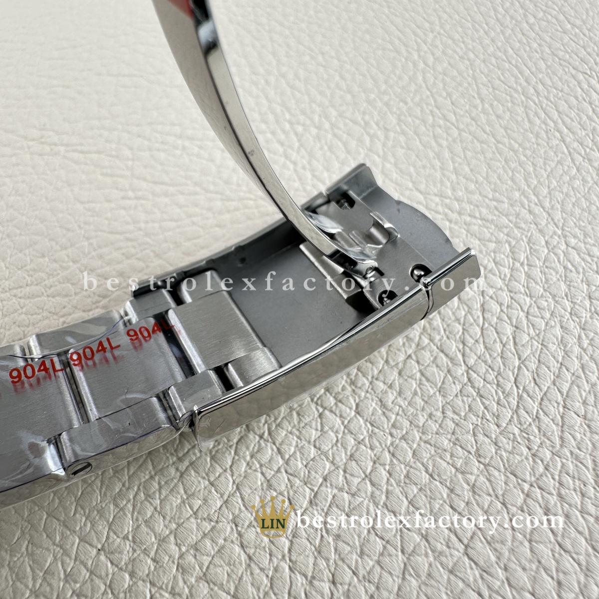 - Il bracciale rappresenta l’Oyster moderno nella sua forma più pura. Il design a tre maglie con maglie esterne satinate e maglia centrale lucida offre comfort e carattere. L’Oysterclasp può sembrare semplice rispetto ai modelli sportivi, ma Clean Factory lo ha realizzato perfettamente: chiusura fluida, blocco sicuro e quel “clic” soddisfacente che garantisce fiducia. Il sistema Easylink da 5 mm si nasconde all’interno, pronto per quei giorni in cui il polso si gonfia.