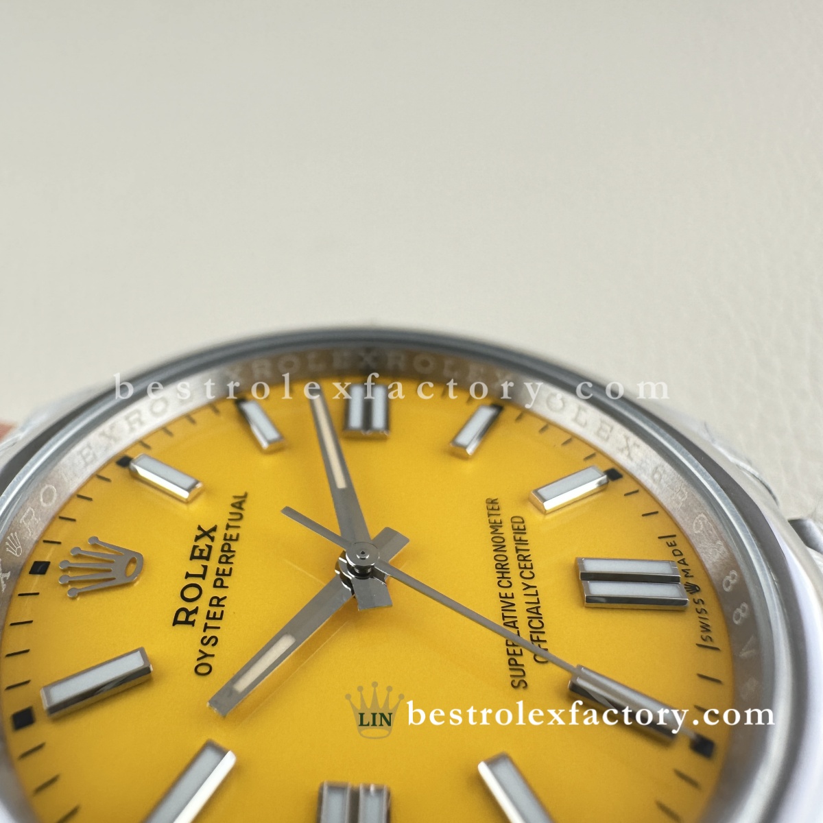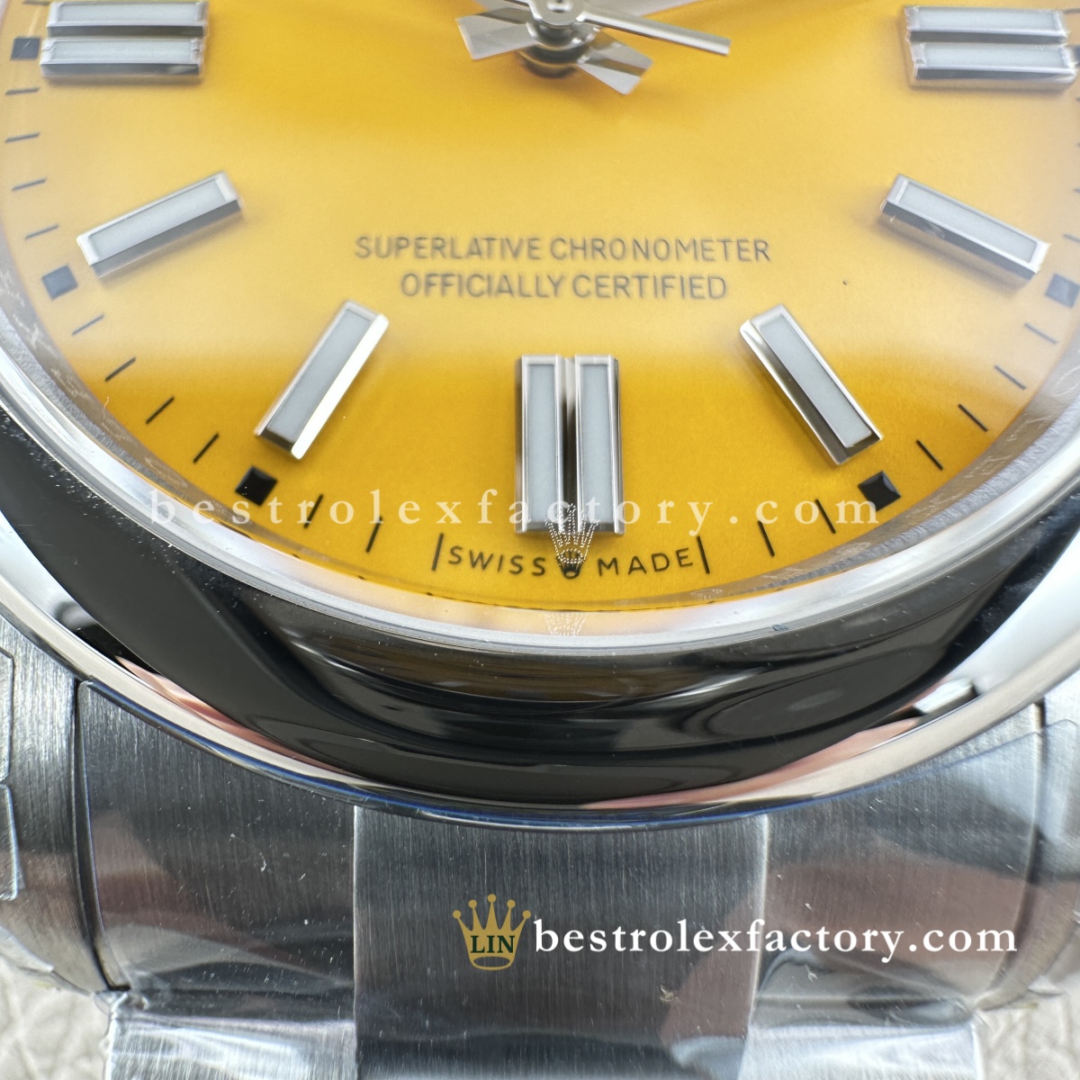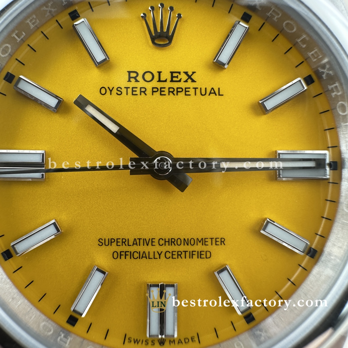 - La stampa del quadrante è curata anche sul giallo. Grazie alla vernice svizzera a base d’olio, le scritte "OYSTER PERPETUAL" alle ore 12 e "Superlative Chronometer Officially Certified" alle ore 6 hanno forme consistenti e spaziature corrette. Il bianco mantiene un contrasto uniforme sullo sfondo giallo, un risultato che richiede attrezzature e tecniche di alto livello.
