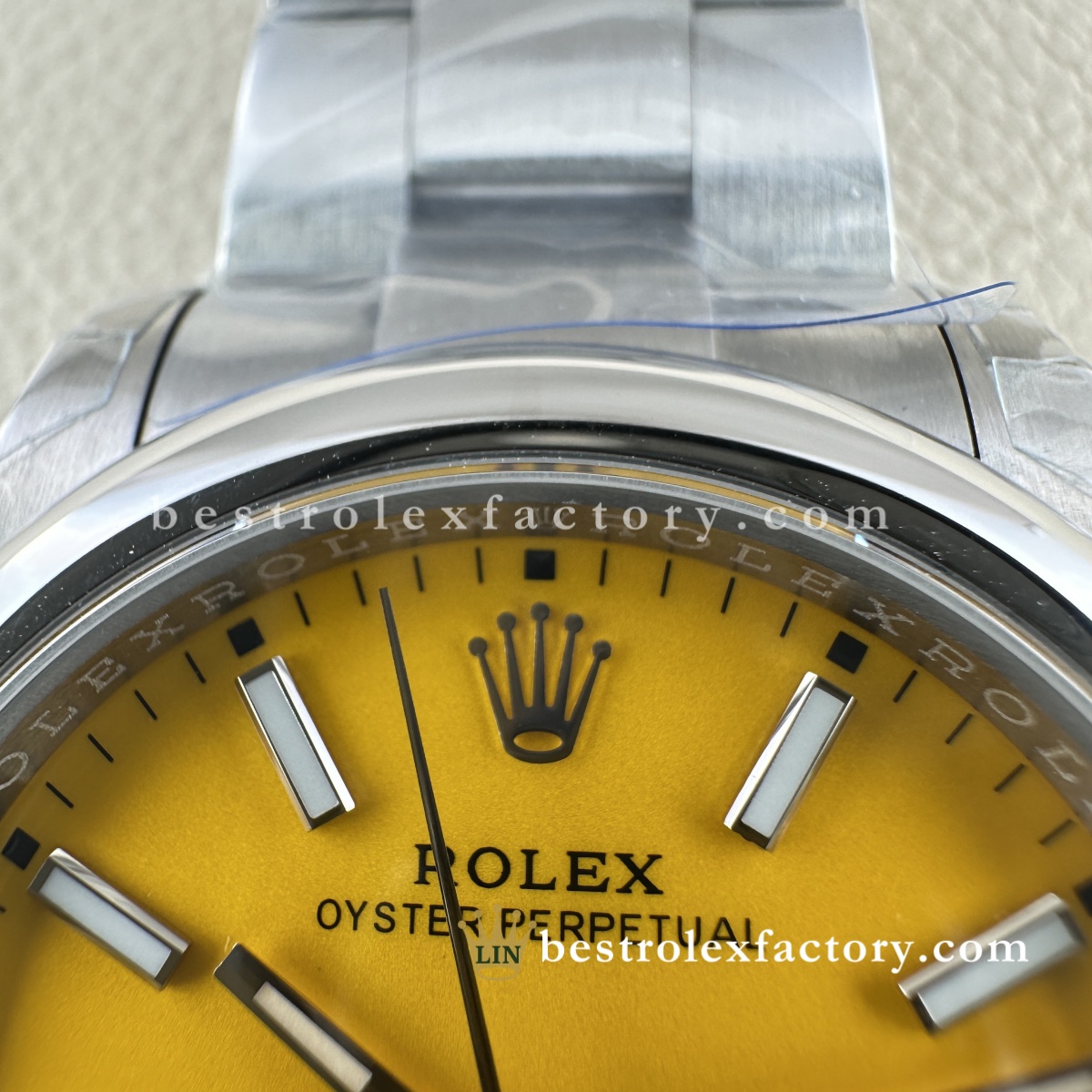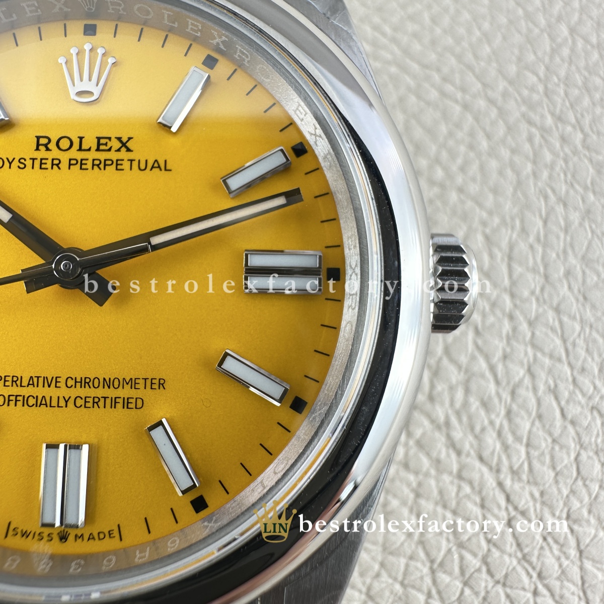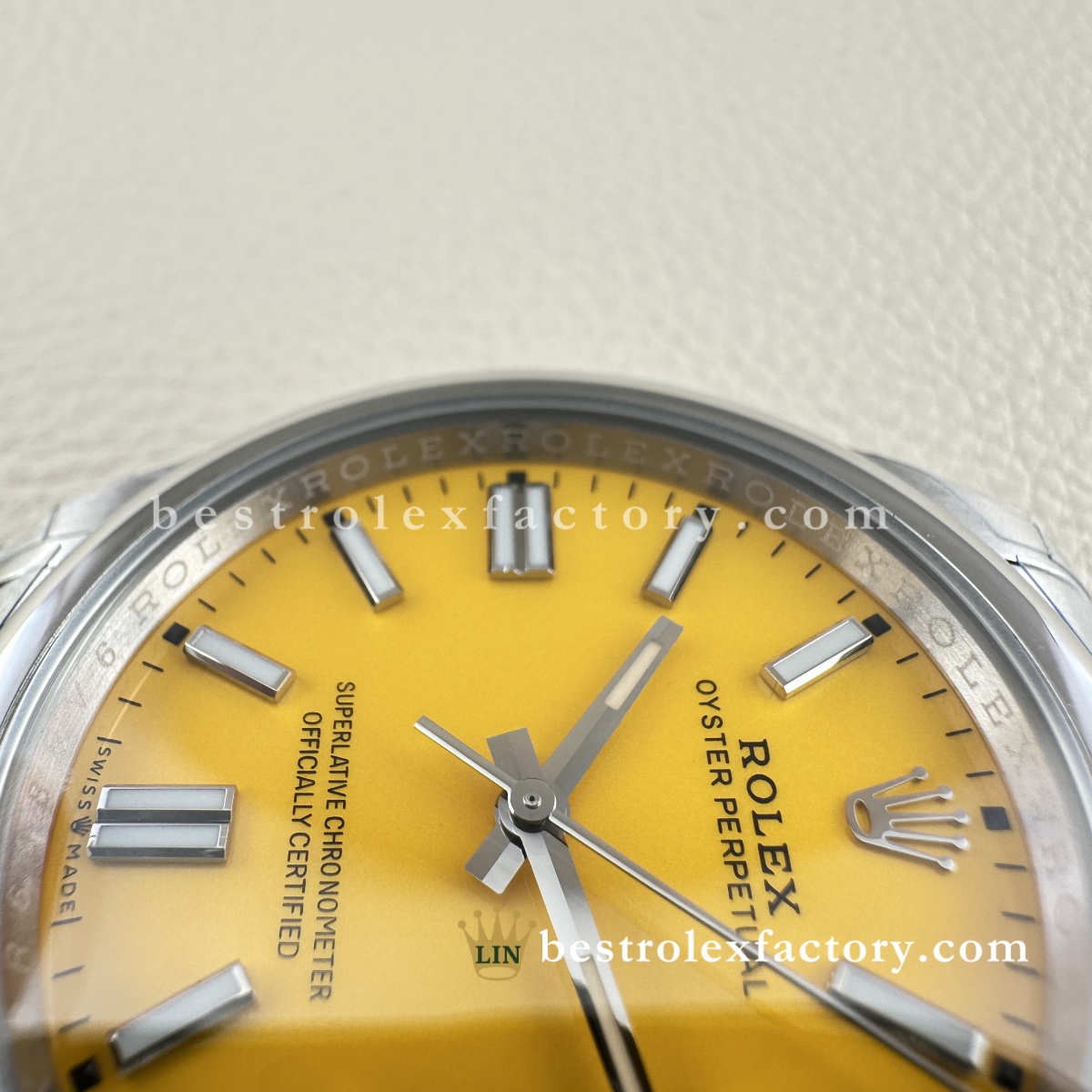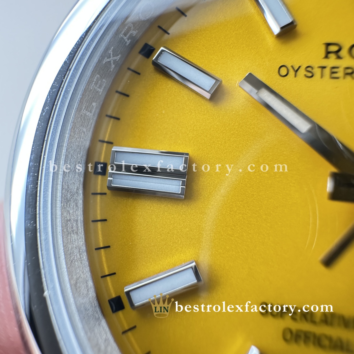 - La stampa del quadrante è curata anche sul giallo. Grazie alla vernice svizzera a base d’olio, le scritte "OYSTER PERPETUAL" alle ore 12 e "Superlative Chronometer Officially Certified" alle ore 6 hanno forme consistenti e spaziature corrette. Il bianco mantiene un contrasto uniforme sullo sfondo giallo, un risultato che richiede attrezzature e tecniche di alto livello.